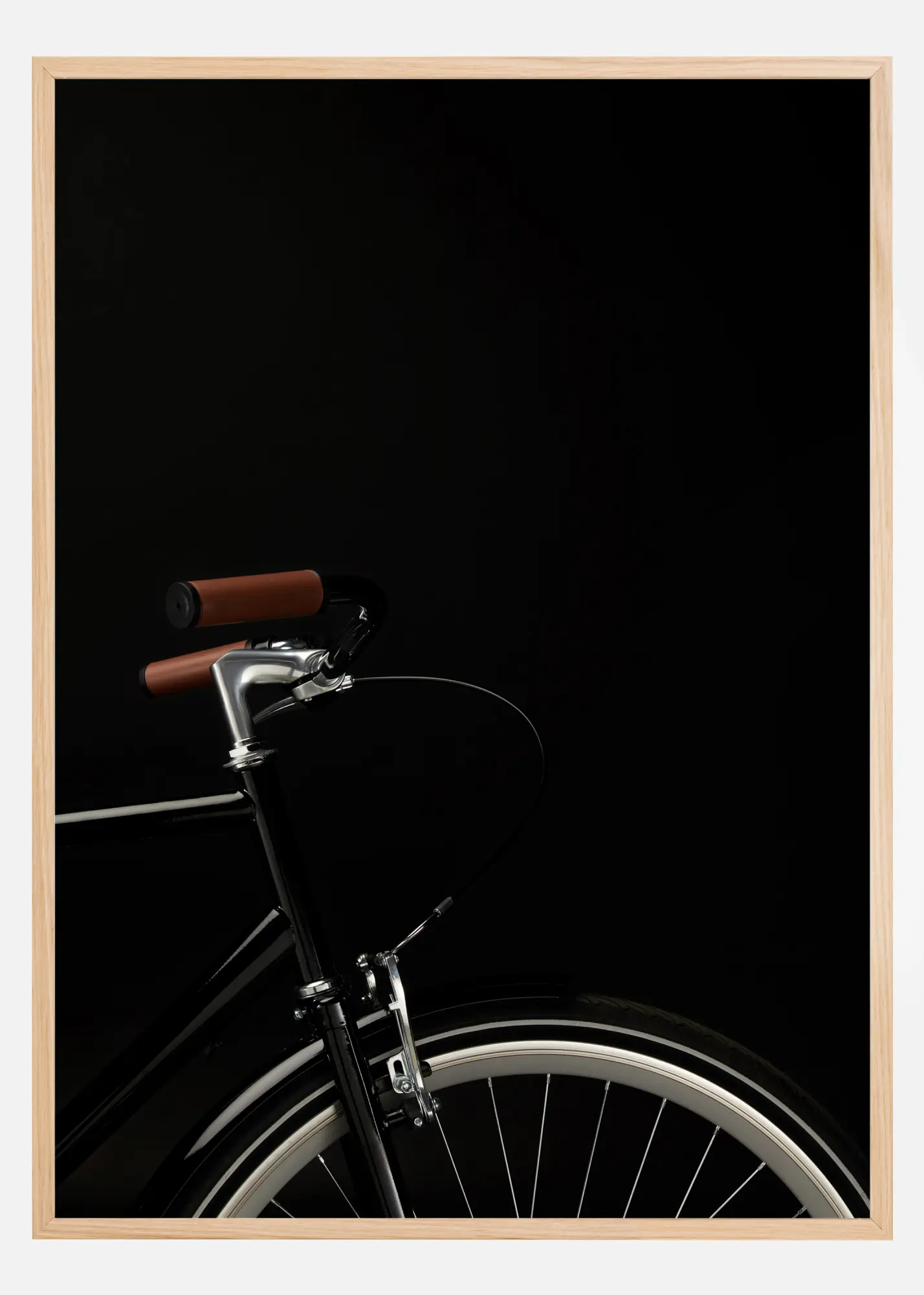 Un poster dramatic cu jumătatea superioară a unei biciclete pe un fundal negru solid. Mânerele maro, cadrul din crom strălucitor și anvelopa albă ies în evidență puternic pe negru. Pentru un pasionat de ciclism, această imagine este un must-have.