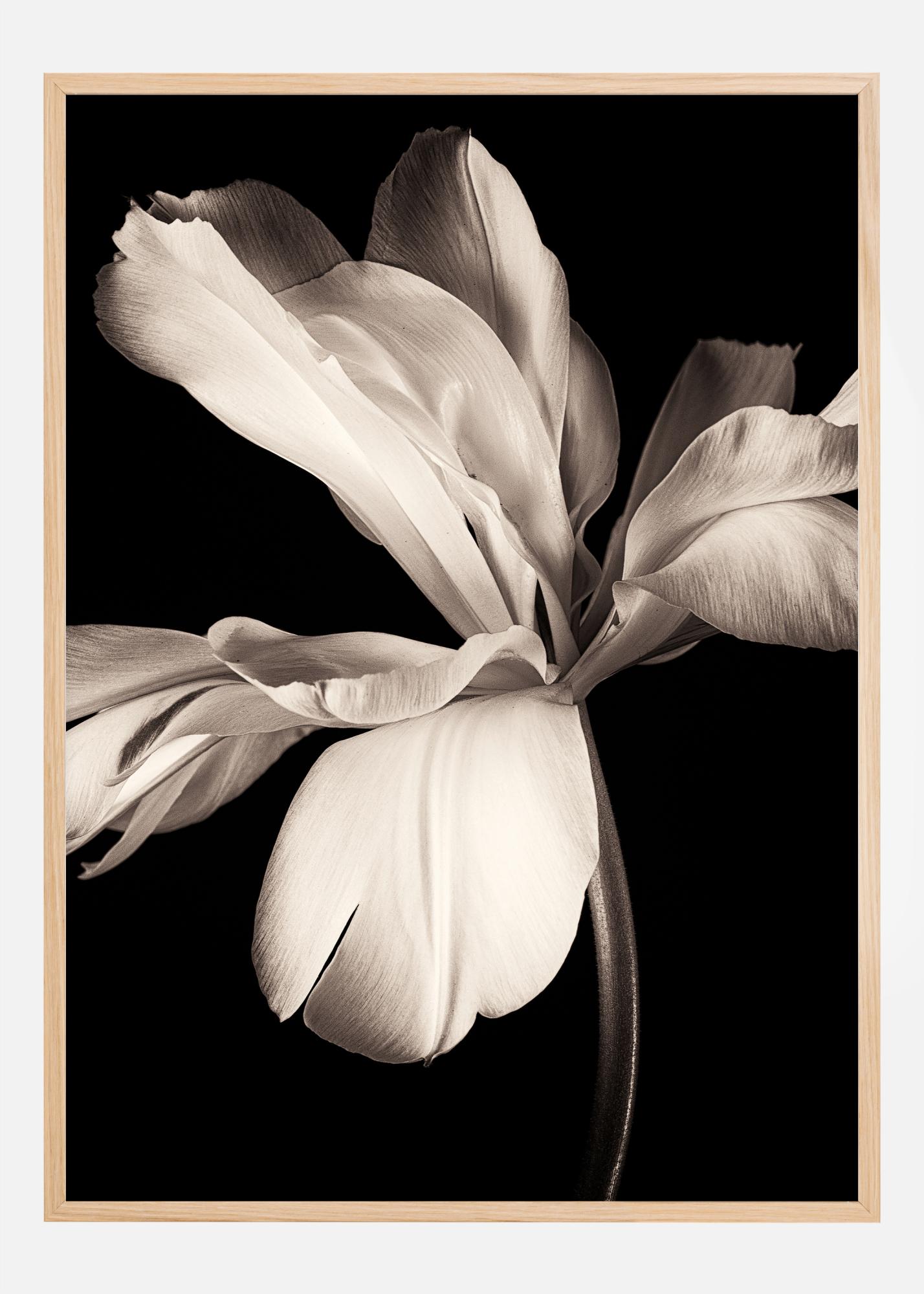 Un poster macro cu o floare și petalele ei. Petalele albe moi și palide se răsucesc și se îndoaie peste o tulpină puternică pe un fundal negru simplu. Obiectivul macro surprinde toate detaliile și face din aceasta o alegere perfectă pentru un entuziast al florilor. Admiră detaliile din această imagine.