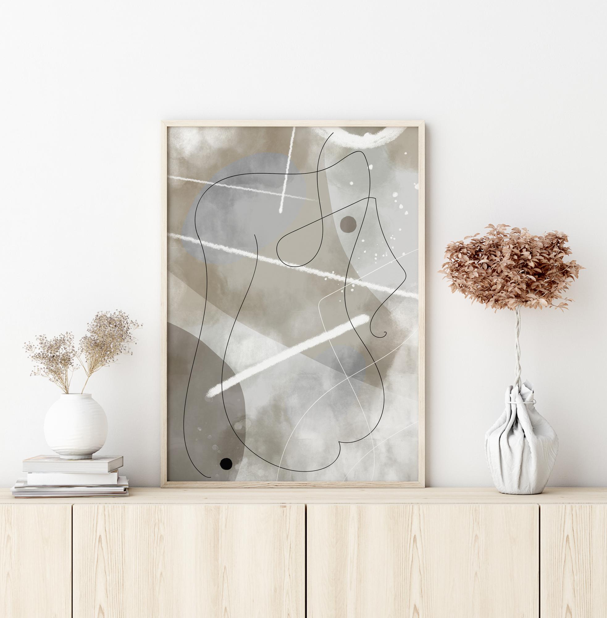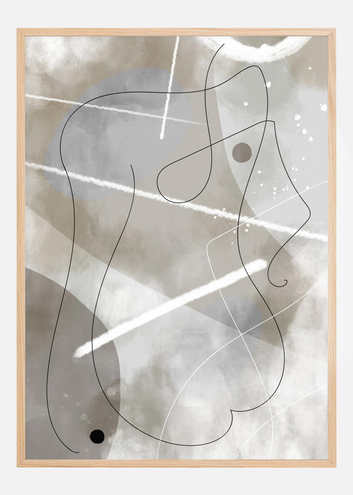 Un poster abstract cu un chip din linii moi. În spatele liniilor subțiri, fața are un fundal eteric tulbure albastru și gri. Alte linii și forme abstracte trec pe lângă, făcând din aceasta o operă mai complexă. Descoperiți această imagine în confortul casei dumneavoastră.