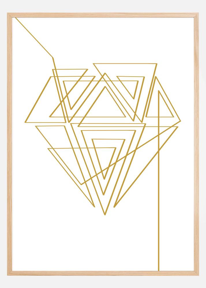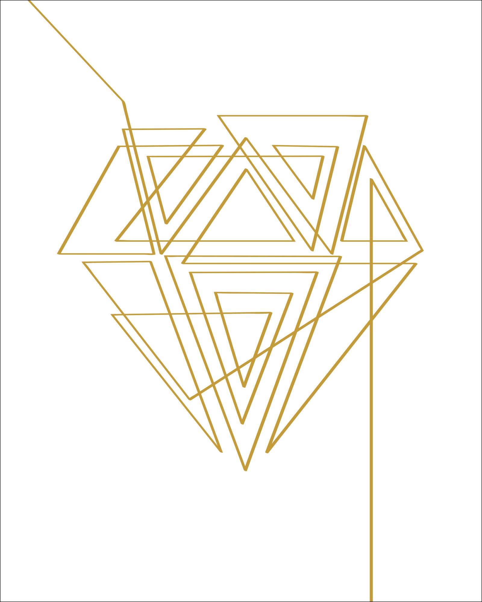 Un poster abstract cu un diamant de linii geometrice aurii. Acest diamant este format în mod complicat din diferite forme triunghiulare într-o singură linie lungă și neîntreruptă. Urmărește linia și vezi dacă poți desluși întregul model. Lucrarea este realizată pe un fundal alb, astfel încât se potrivește cel mai bine pe un perete de culoare crem sau aurie.