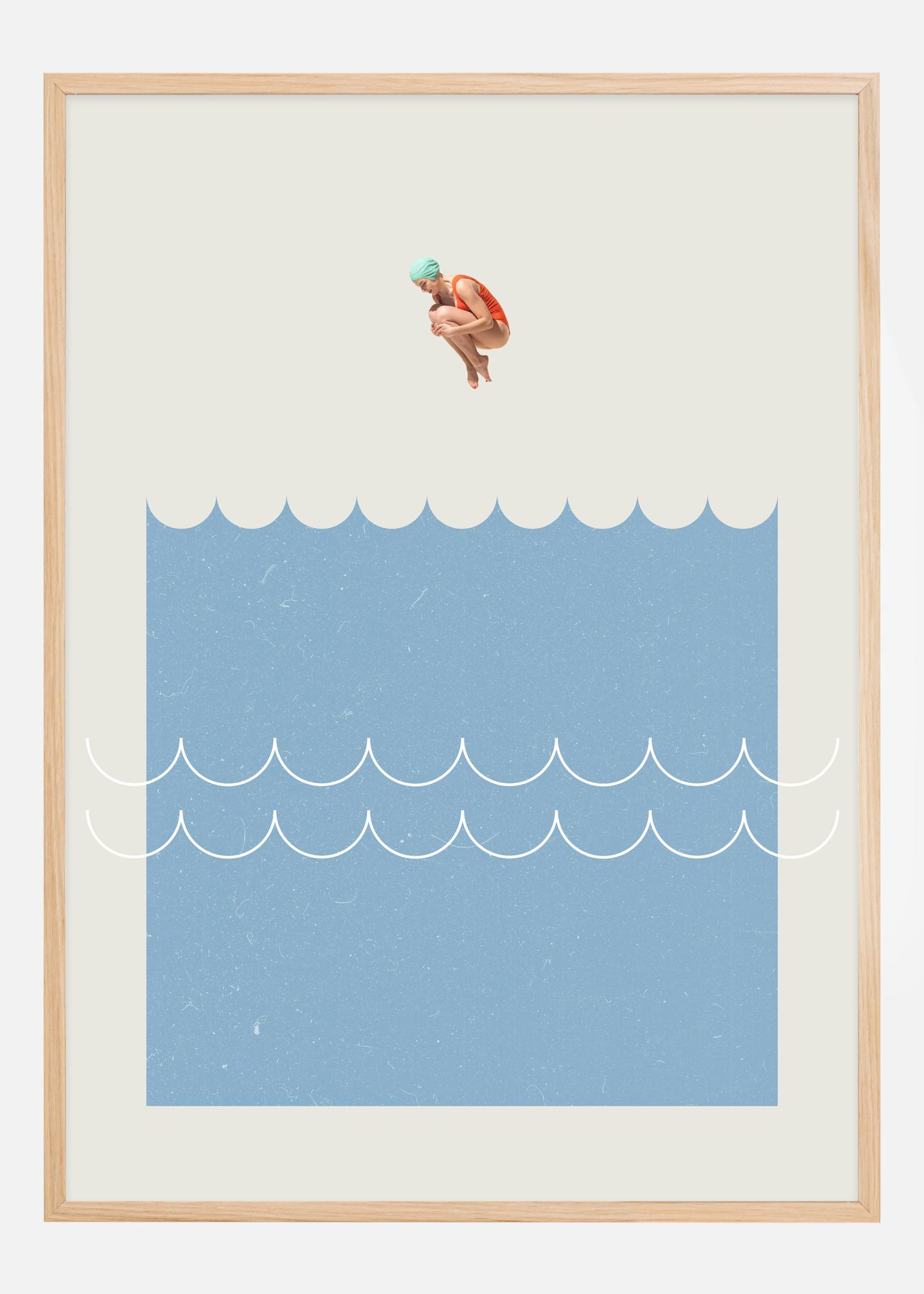 Afișul acesta este o interpretare jucăușă a unui strop de vară, în care o figură mică în costum de baie și cască de înot este surprinsă în cădere liberă către o ilustrație stilizată a valurilor. Designul minimalist combină realitatea cu abstracția, oferind o perspectivă creativă și revigorantă asupra temei clasice a verii și bucuriei băii.
