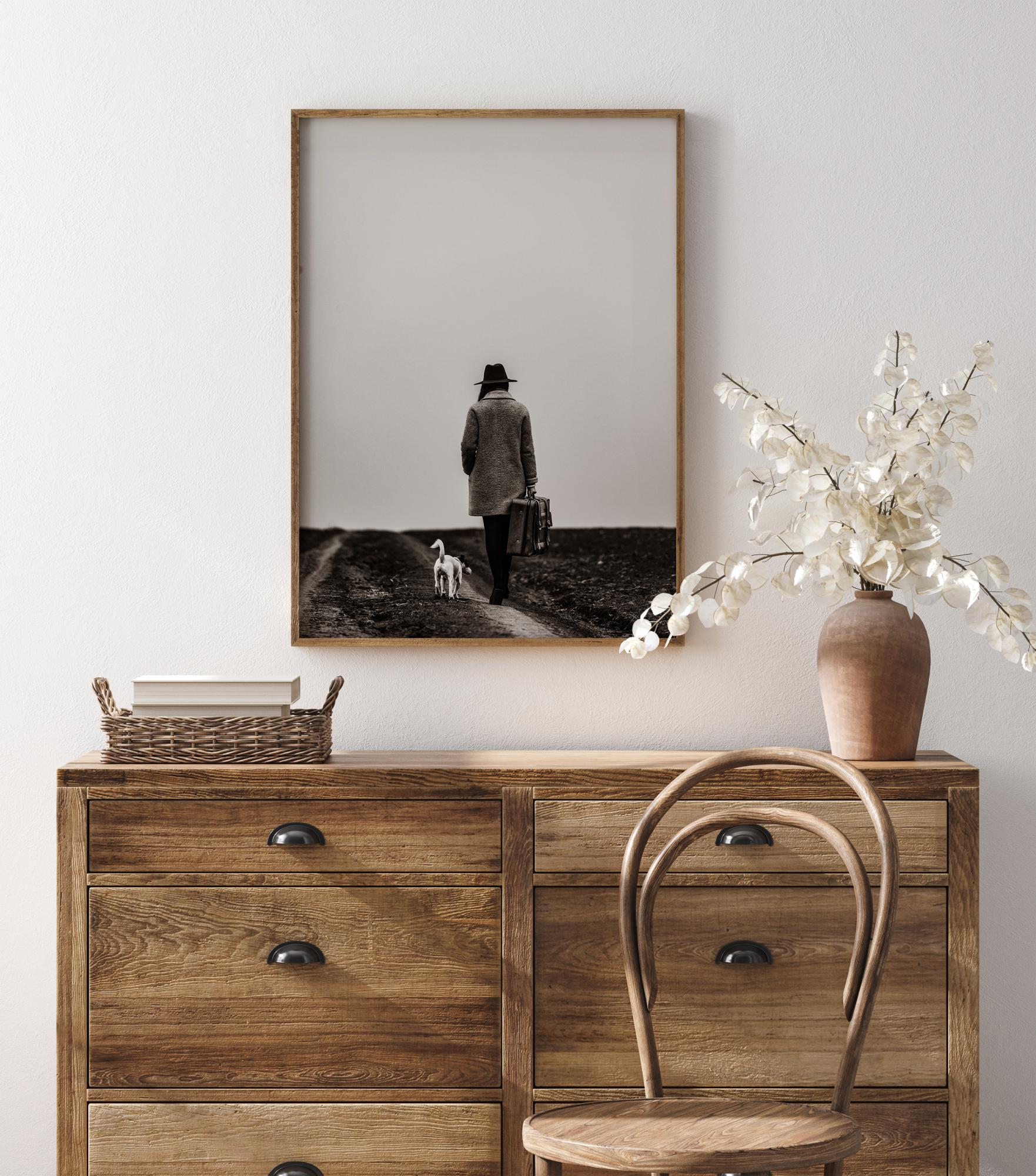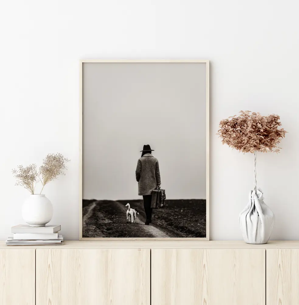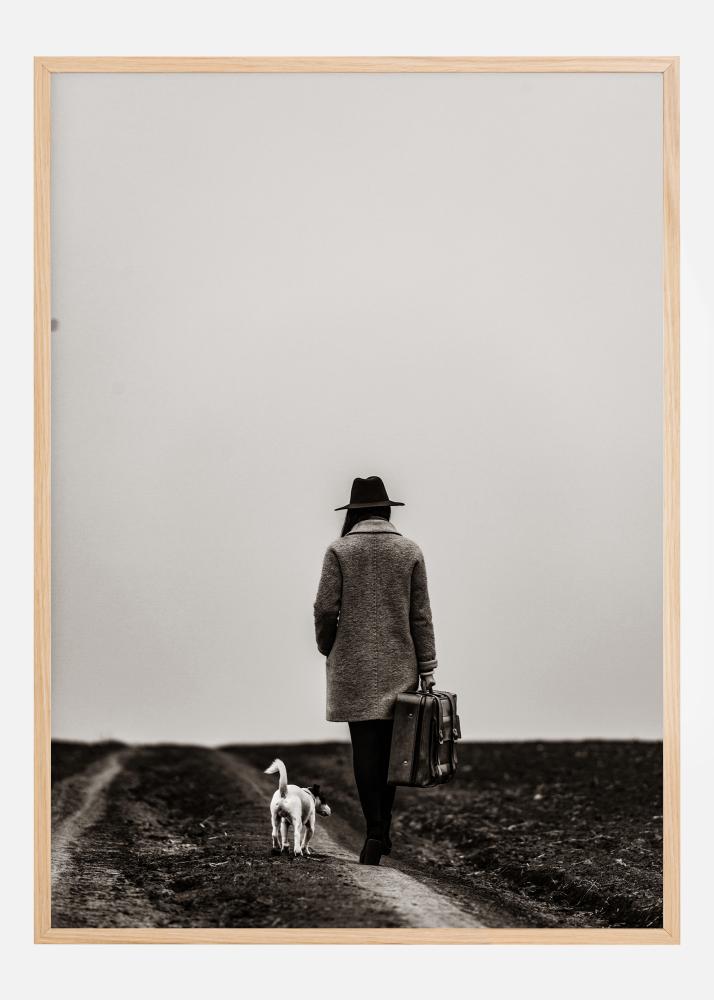 Un poster minimalist al unei femei care merge de-a lungul unui drum cu câinele ei. Cele două benzi se întrepătrund în depărtare, femeia care poartă o jachetă lungă și o valiză, iar terrierul ei merge alături de ea. Cerul larg și luminos este primitor. Alăturați-vă acestei femei în călătoriile ei când această imagine alb-negru atârnă pe peretele dumneavoastră.