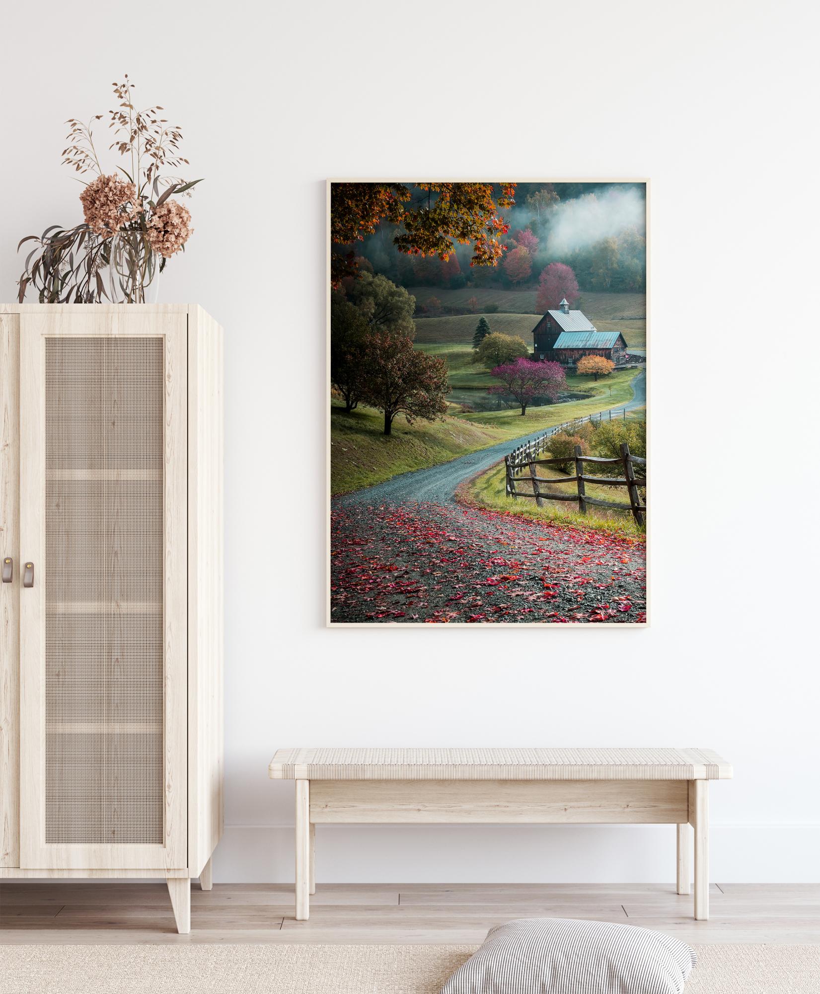Un poster cu natură care prezintă un peisaj rural cu un drum mic, o fermă idilică și copaci de toamnă. Frunze roșii sunt împrăștiate pe drumul care duce spre o vale și către casa mică. O rază de soare pătrunde în vale și luminează frunzele de toamnă ale copacului. Simte farmecul rural atunci când agăți această imagine acasă.