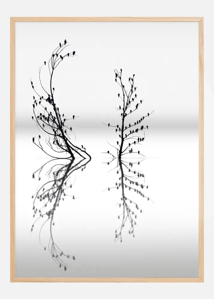 Un poster stilizat cu două crengi care ies din apă. Crengile întunecate, îndoite și răsucite, își proiectează reflecțiile în apa liniștită de dedesubt. Nuantele de albastru și alb atenuate din această lucrare oferă o atmosferă liniștită de care te poți bucura având această imagine pe peretele din casă.