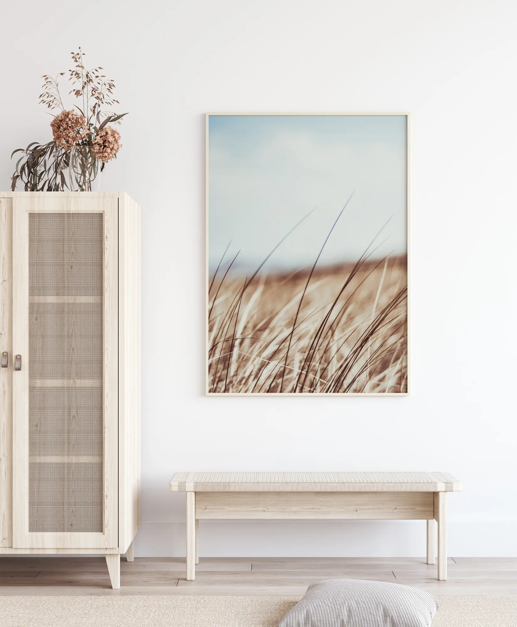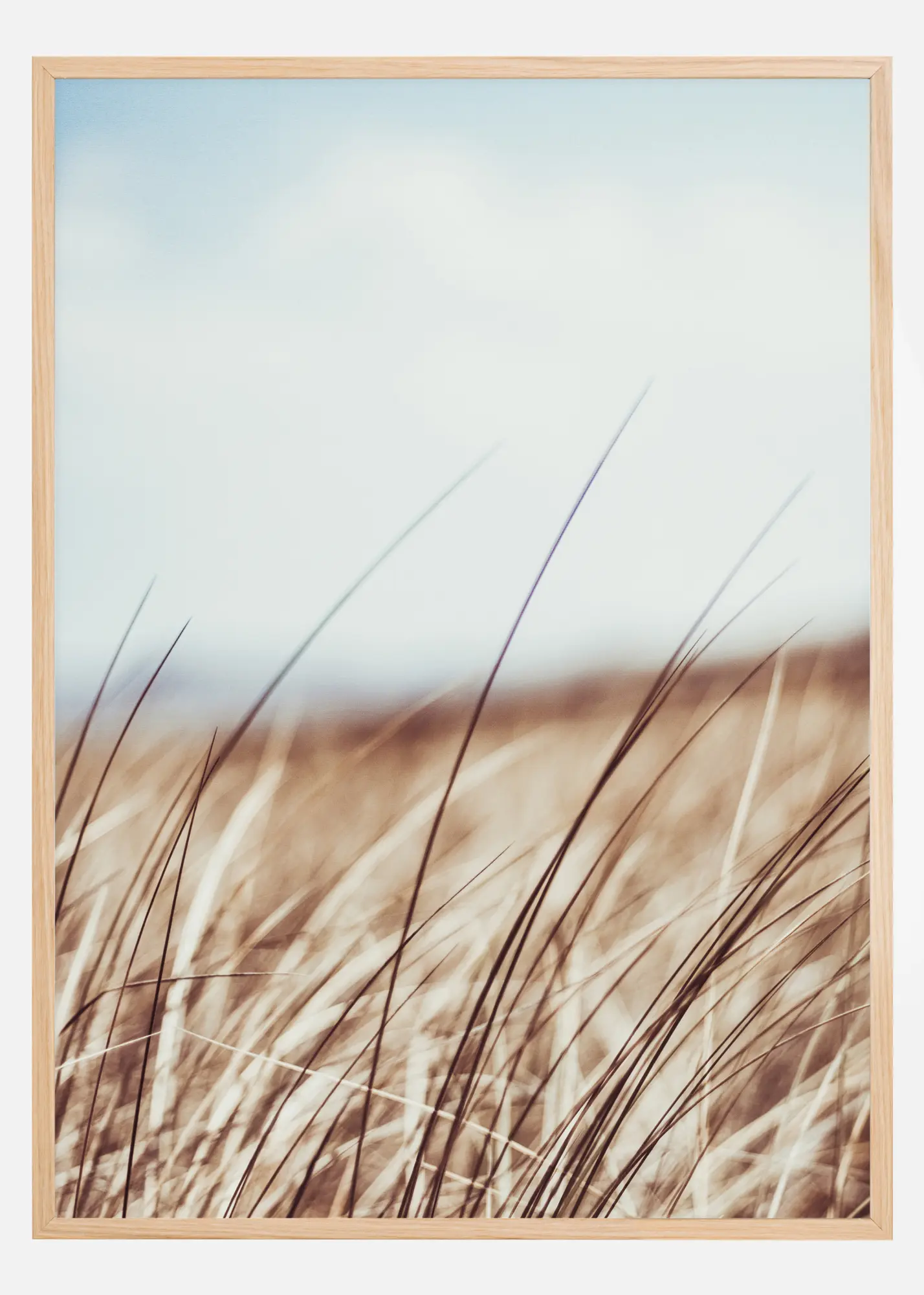 Un poster simplu cu iarbă care suflă în vânt sub un cer albastru înnorat. Nuanțele estompate de maro și galben ale ierbii și tulpinile lungi îndreaptă privirea în sus și în nori. Visează la depărtare cu ajutorul acestui câmp liniștitor de iarbă înaltă atârnând pe peretele tău.