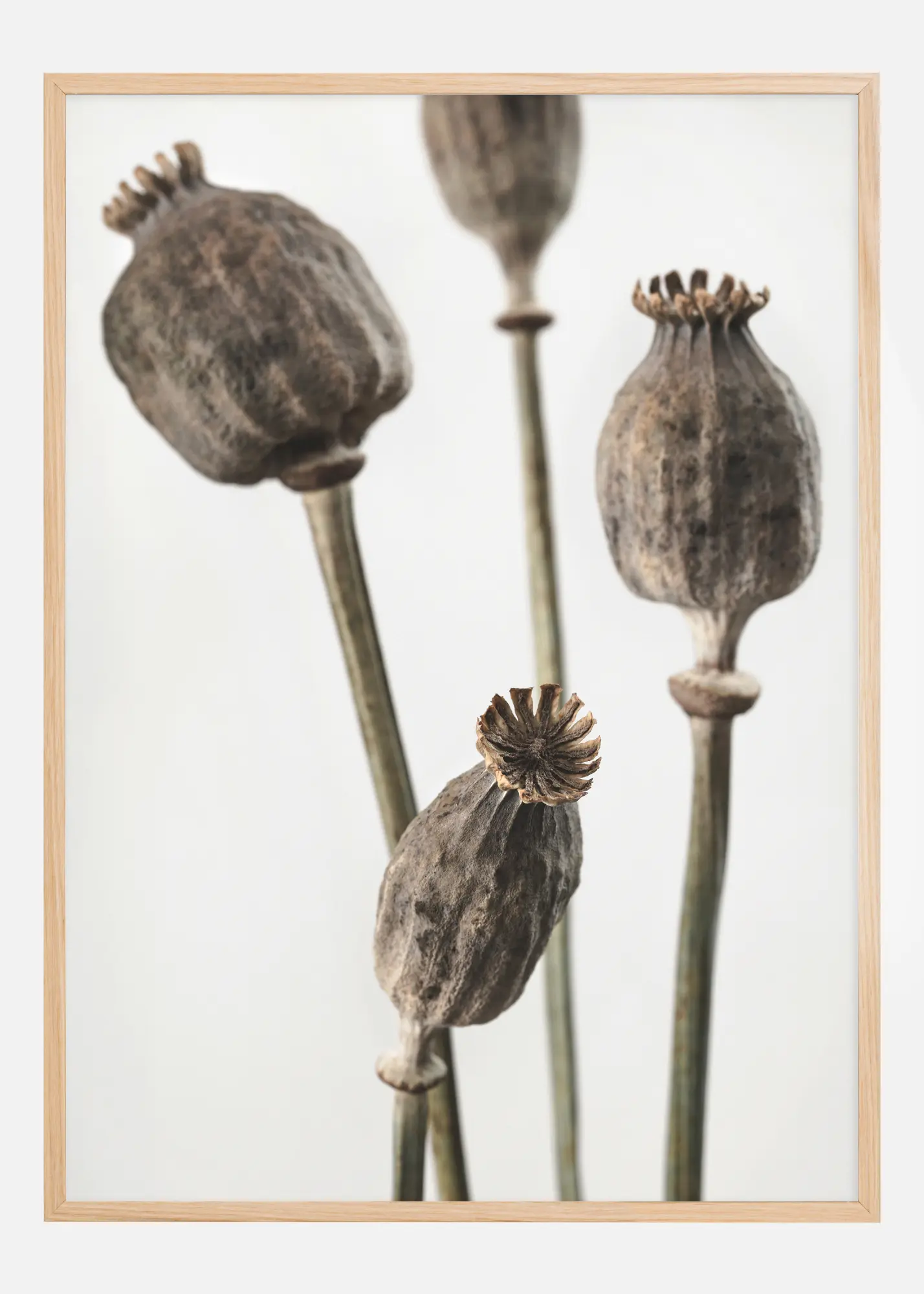 Această posteră artistică se concentrează pe frumusețea rustică a capsulelor de mac uscate. Realizarea sa detaliată evidențiază formele sculpturale și tonurile pământești, creând o senzație de adâncime și textură. Culorile neutre și fundalul simplu subliniază forma unică a fiecărei capsule de mac și frumusețea efemerității lor.