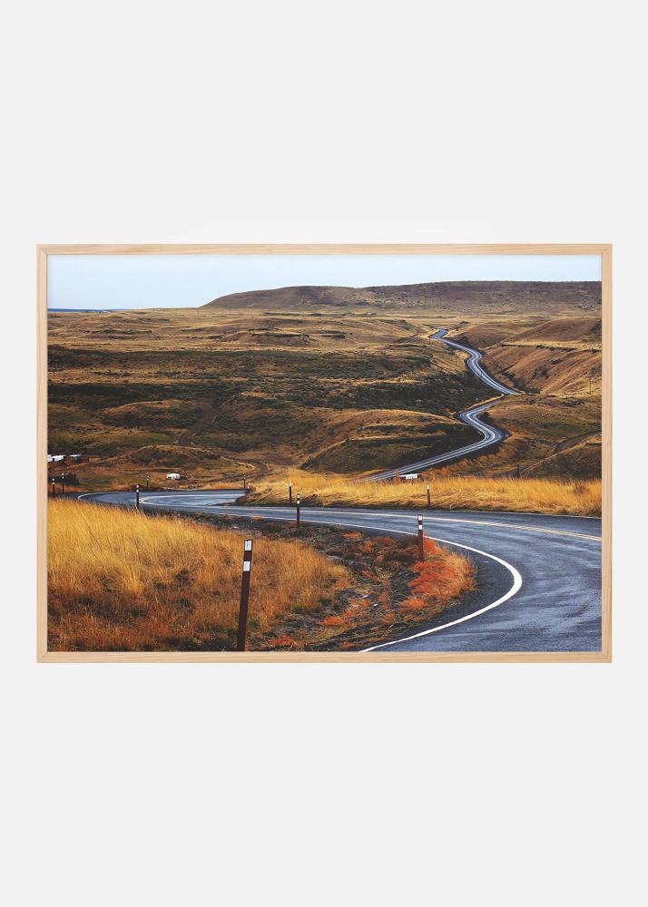 Poster cu un drum asfaltat care se serpuieste printr-un peisaj stepar ars de soare. Nuanțele de galben-maro ale ierbii, în contrast cu suprafața rece a asfaltului care se sparge prin peisajul deschis, fac ca privirea să fie atrasă în imagine și să urmeze drumul. Afișul se potrivește bine într-o ramă minimalistă, unde motivul poate să iasă în evidență și poate fi combinat cu plăcere cu alte tablouri pentru un anumit temă.