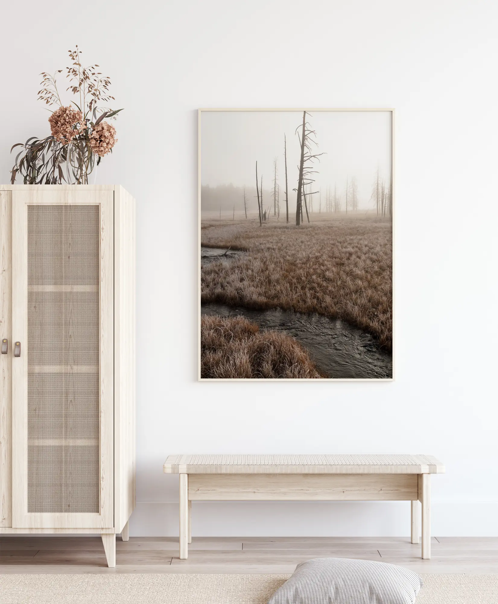 Un poster de peisaj supranatural cu o câmpie cu copaci morți și un râu care curge prin ea. În această fotografie de dimineață devreme, ceața învăluie copacii și iarba galbenă. Urmărește râul cum șerpuiește prin peisaj până la pădurea îndepărtată. Pierde-te într-un alt timp și loc când îl agăți pe perete.