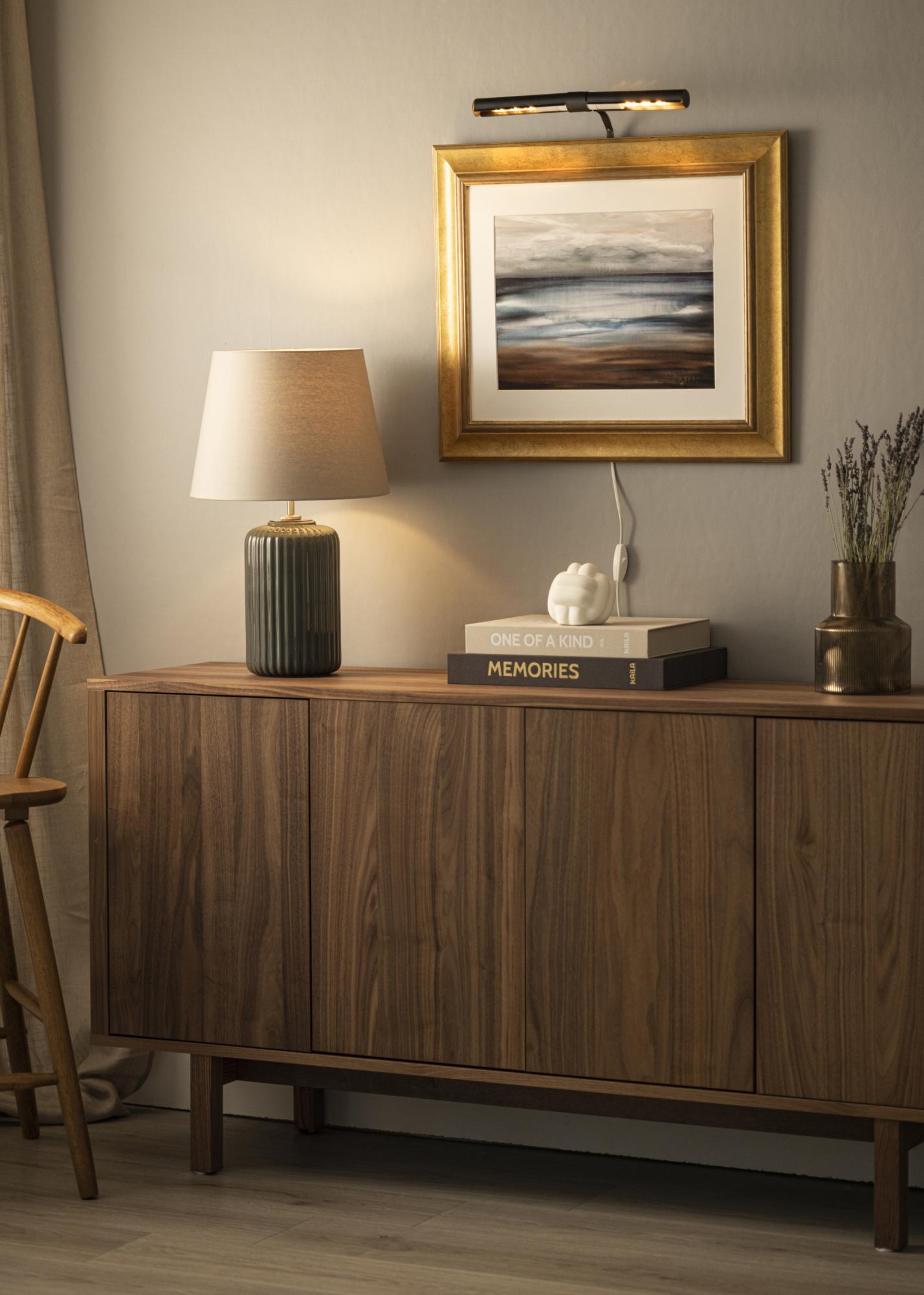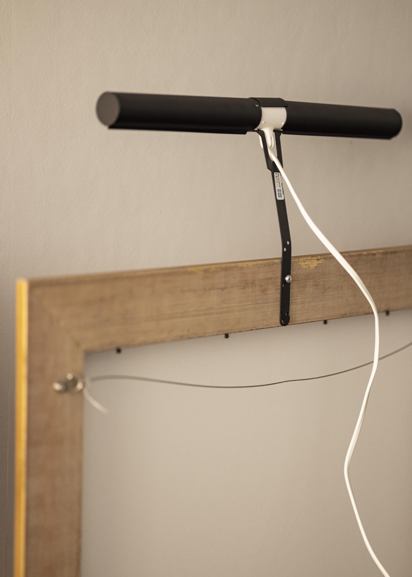 De obicei, fixezi lumina pentru tablouri pe partea din spate a ramei, dezavantajul fiind că este necesară o ramă de lemn (unele rame compozite sunt de asemenea potrivite) care are un profil larg pentru a putea înșuruba în ramă. Cu prinderea noastră de perete, nu trebuie să te gândești la acest aspect și poți monta cu ușurință lumina pentru tablouri direct pe peretele din spatele tabloului.