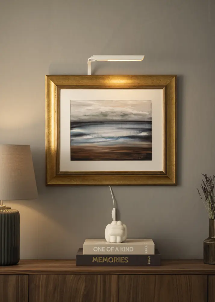 De obicei, fixezi iluminarea pentru tablouri pe spatele ramei, dezavantajul fiind că este necesară o ramă din lemn (unele rame din compozit sunt de asemenea potrivite) care are un profil lat pentru a putea fi înșurubată în ramă. Cu suportul nostru de perete, nu trebuie să te gândești la acest aspect și poți monta iluminarea pentru tablouri direct pe peretele din spatele tabloului.