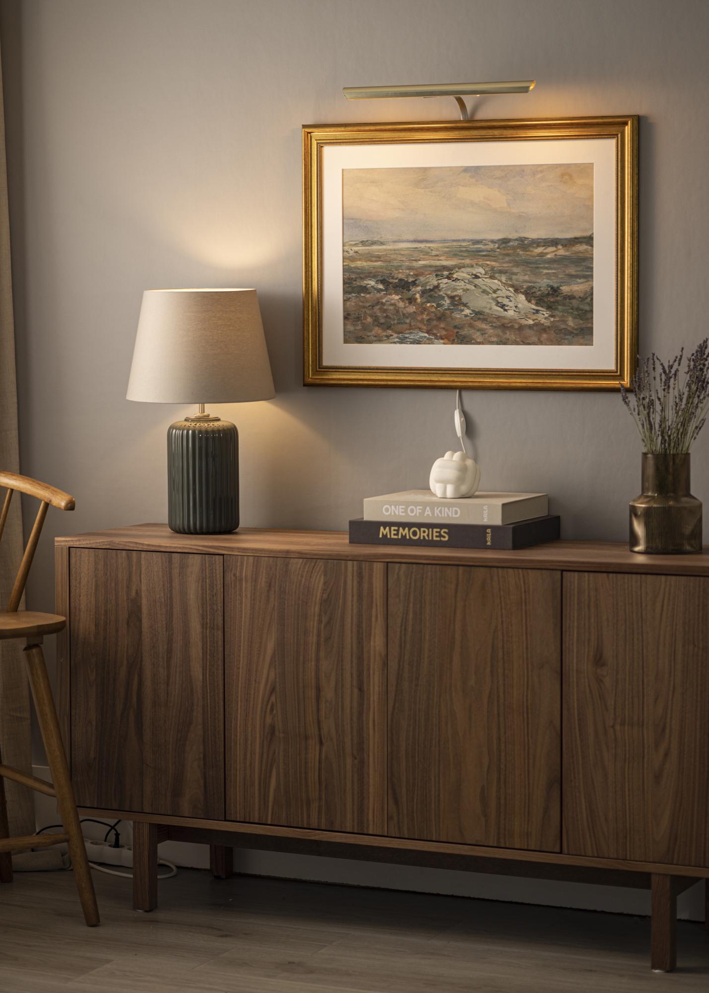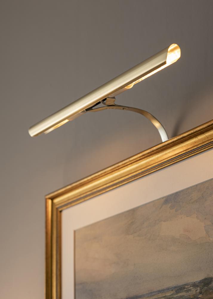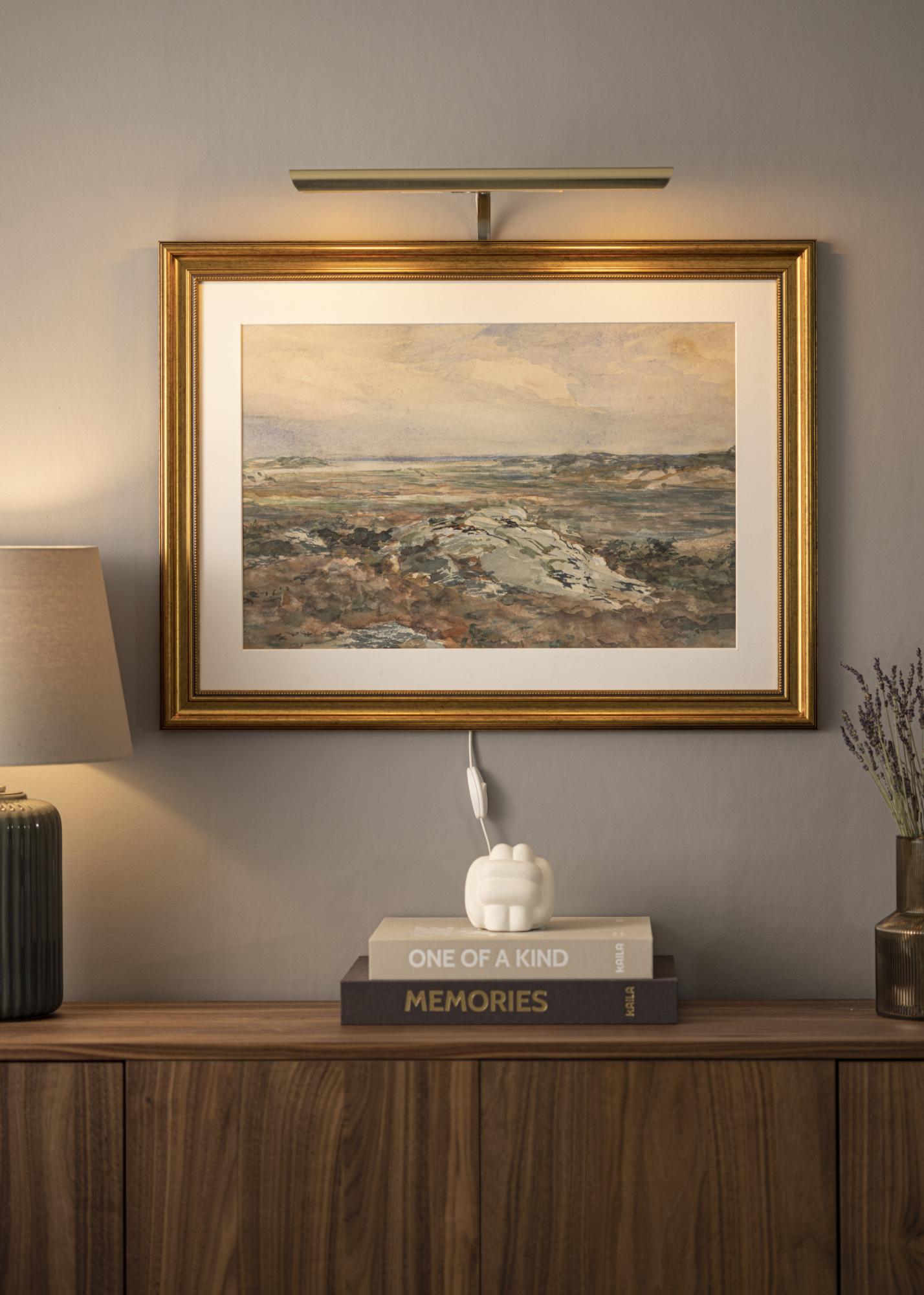 De obicei, fixezi iluminatul pentru tablouri pe spatele ramei; dezavantajul acestui lucru este că este necesar un cadru de lemn (unele cadre compozite sunt, de asemenea, bune) care să aibă un profil lat pentru a putea fixa șuruburile în ramă. Cu suportul nostru pentru montare pe perete nu trebuie să îți faci griji în privința aceasta, ci pur și simplu montezi iluminatul pentru tablouri direct pe peretele din spatele tabloului.