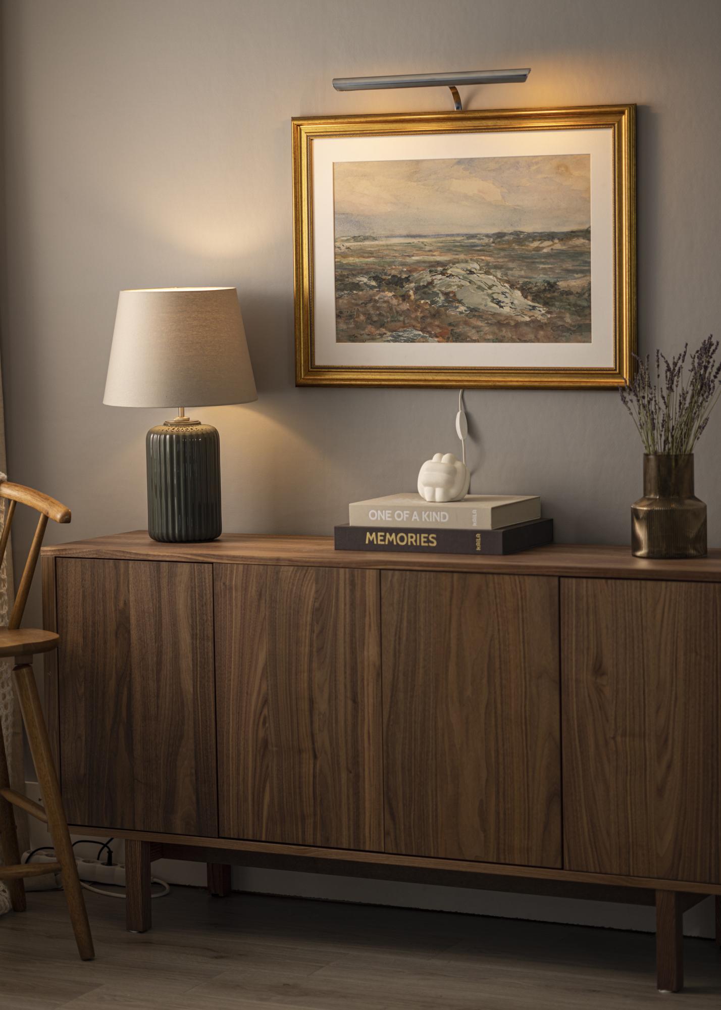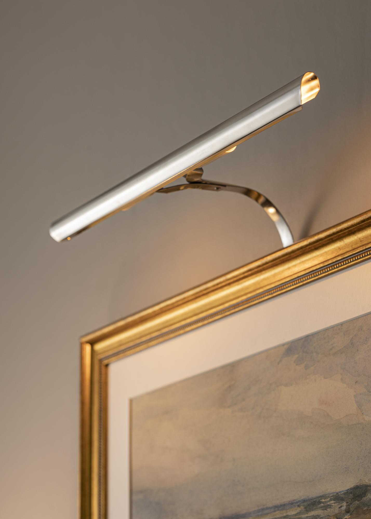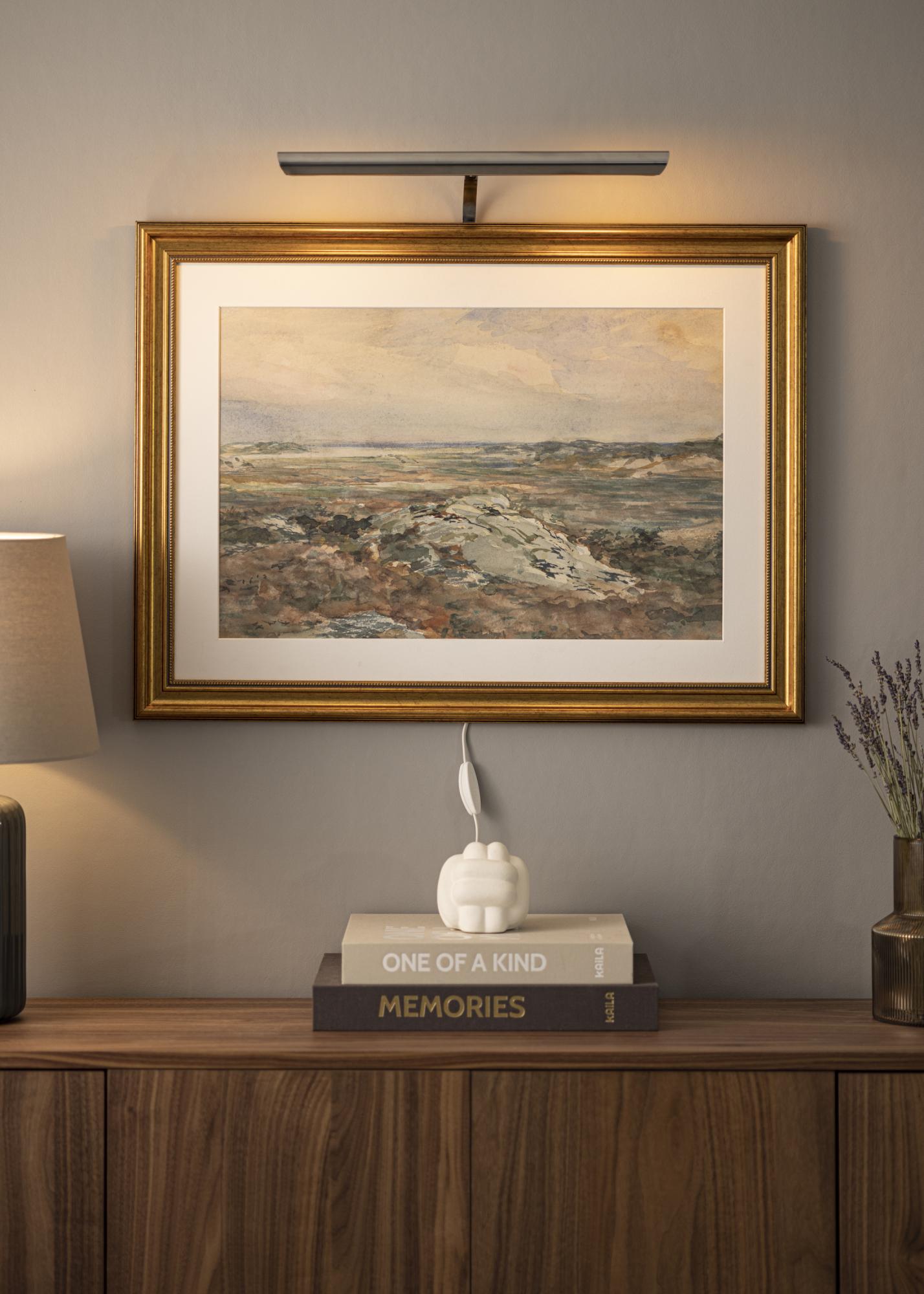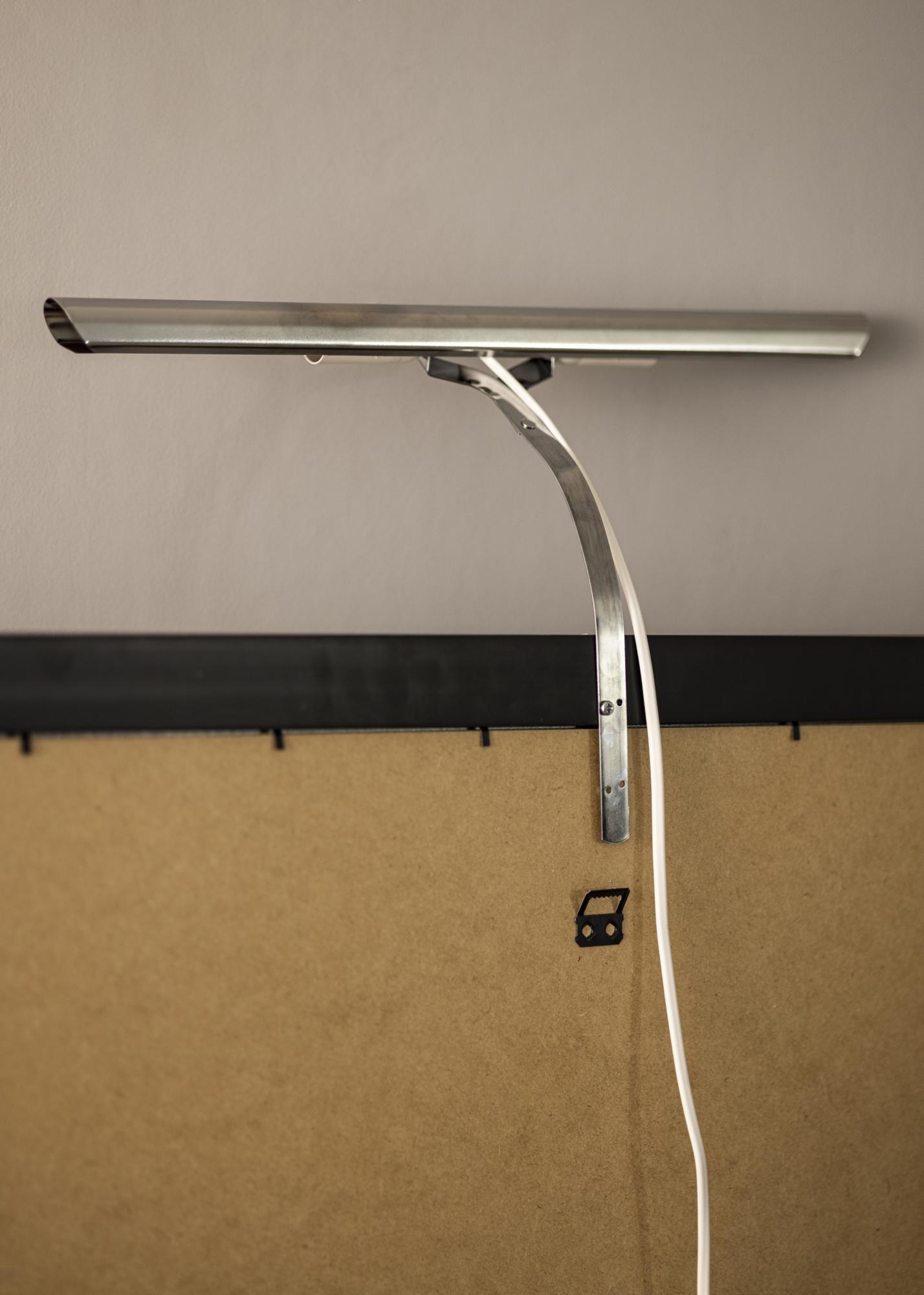 În mod normal, fixezi iluminatul pentru tablouri pe spatele ramei, dezavantajul fiind că este necesar un cadru din lemn (anumite rame din compozit sunt de asemenea bune) care să aibă un profil lat pentru a fi posibil să înșurubezi în cadrul ramei. Cu sistemul nostru de montare pe perete, nu trebuie să te gândești la asta, ci montezi iluminatul pentru tablouri direct pe peretele din spatele tabloului.