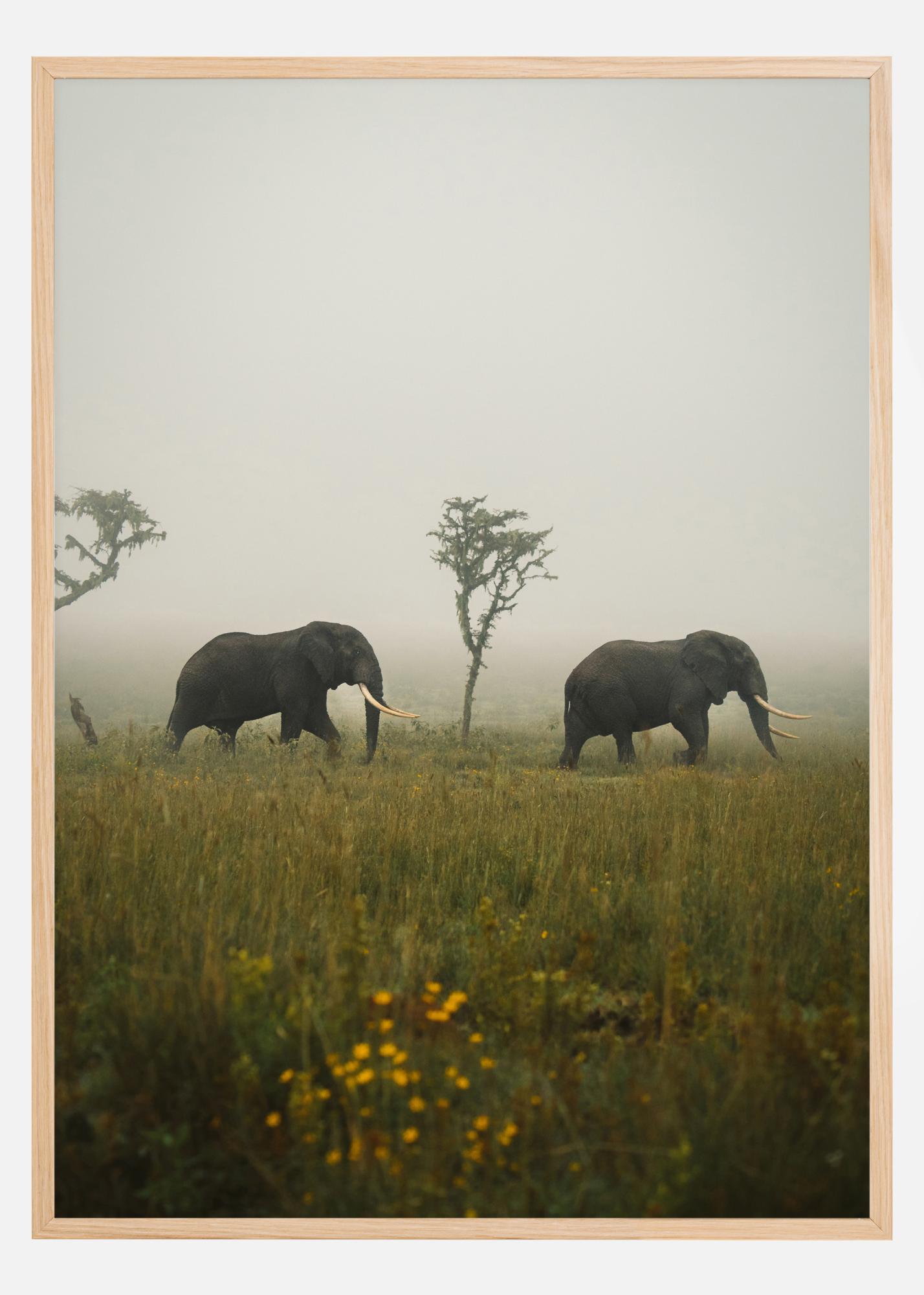 O fotografie de natură a unui cuplu de elefanți care rătăcesc prin iarbă înaltă între copaci sterpi. Ceața densă din fundal creează contraste ascuțite care evidențiază clar animalele mari. Un poster pentru cei care iubesc savana și cei mai mari locuitori ai acesteia!