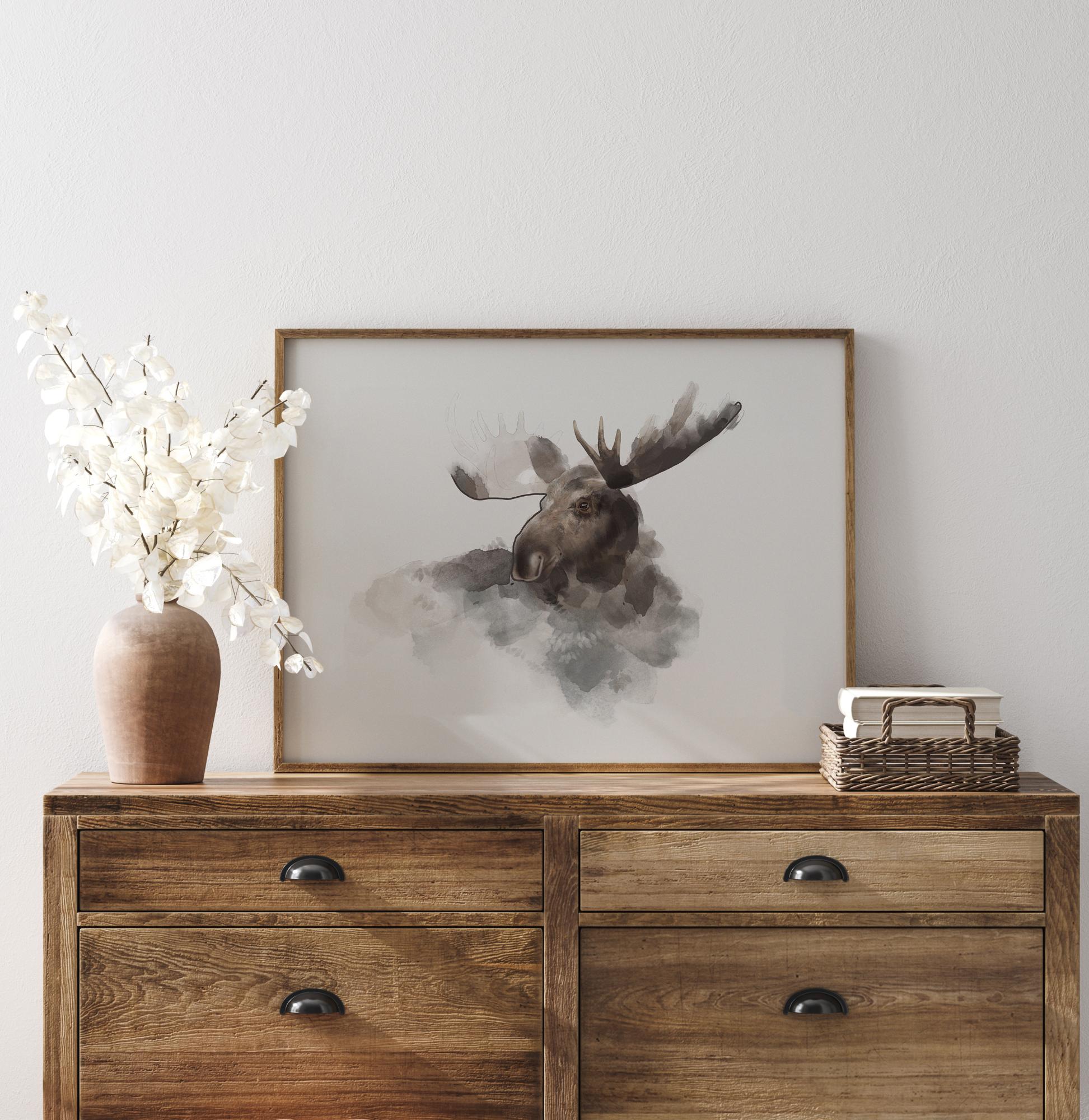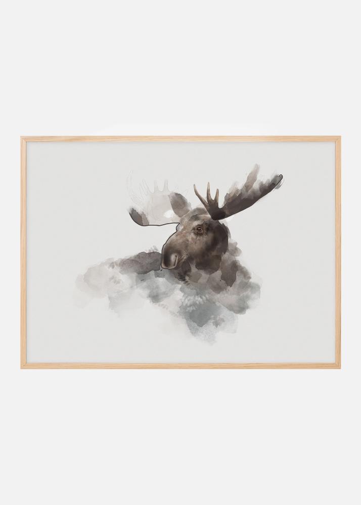 Un poster în acuarelă cu capul unui elan. Trăsăturile moi ale pensulei se adună treptat pe fața elanului, coarnele sale încă nefiind complet formate. Agață această imagine asemănătoare unui nor pe un perete neutru pentru a păstra eleganța delicată a casei tale.