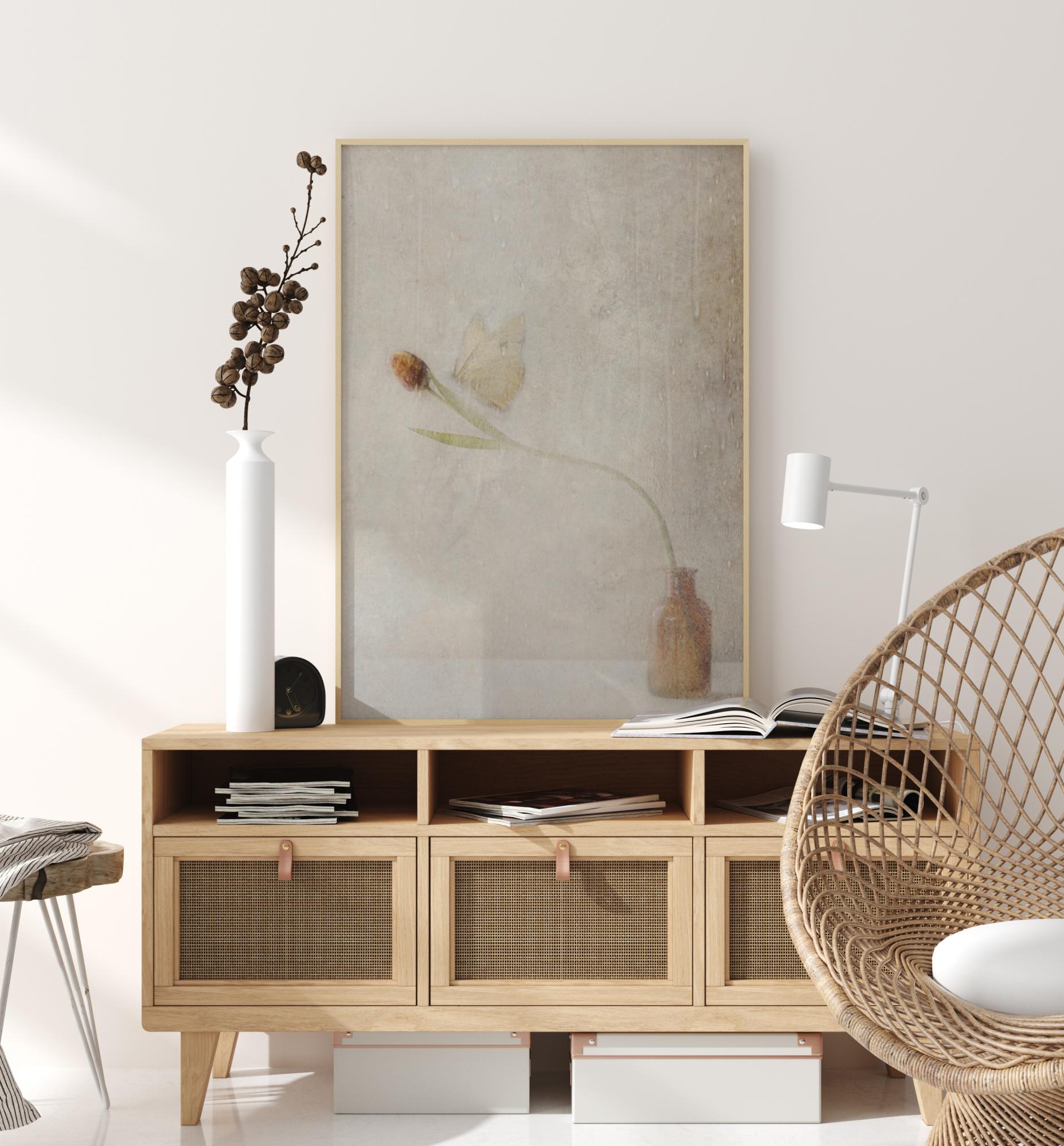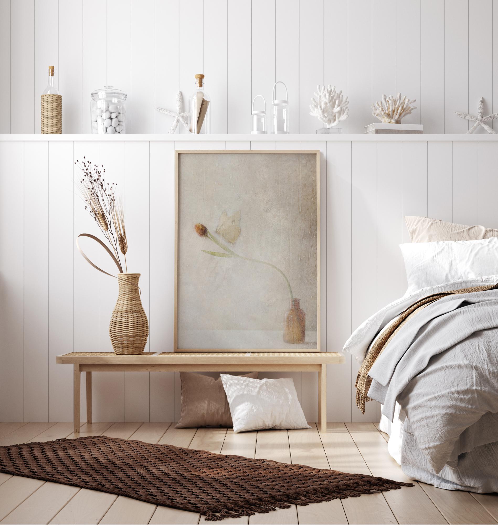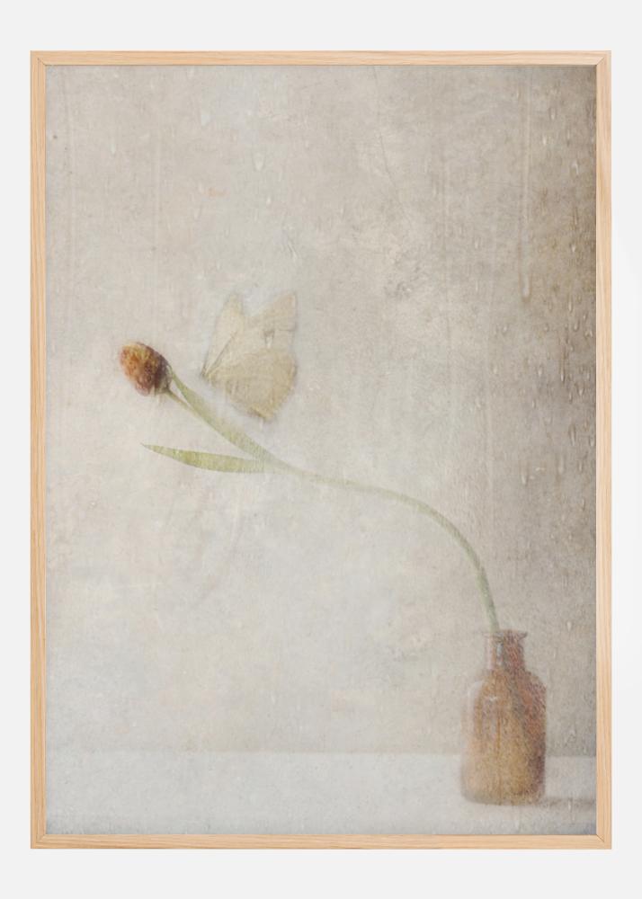 Un poster discret cu un fluture care aterizează pe o floare. Această imagine subtilă cu tonuri maronii oferă căldură camerei. Fluturele aterizează ușor pe floarea care se apleacă spre centrul imaginii. Aripile se contopesc aproape cu peretele din spate în această întâlnire de scurtă durată.