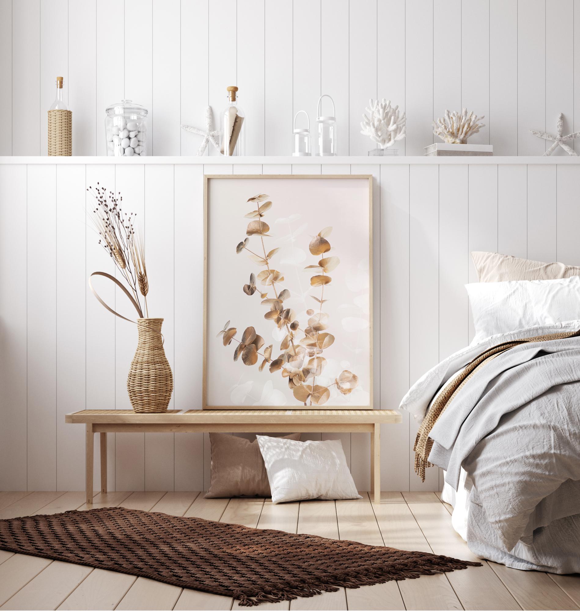 Un poster minunat cu crenguțe de eucalipt auriu. Frunzele aurii și maro sunt moi acolo unde ies în evidență pe fundalul alb. Frunzele sunt rotunde, ceea ce creează forme frumoase în imagine. Acest poster aduce o senzație de calm și eleganță casei tale.