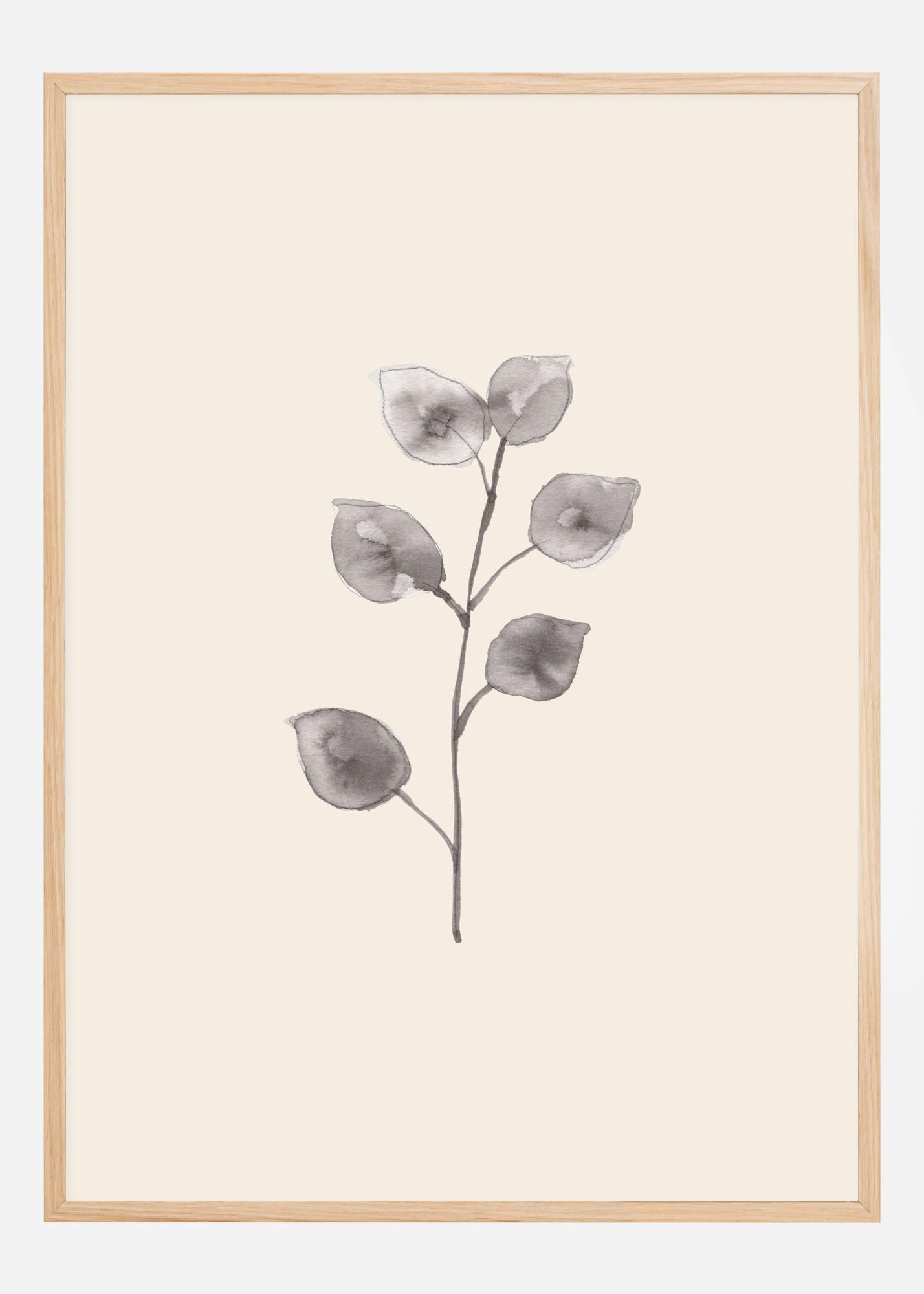 Un poster elegant cu o pictură simplă a unei crengi de eucalipt. Frunzele sunt realizate în stil acuarelă astfel încât sunt moi și marginile aproape s-au estompat. Într-o nuanță simplă de gri, frunzele se evidențiază pe fundalul alb. Agață-l pe un perete verde pentru a adăuga culoare.