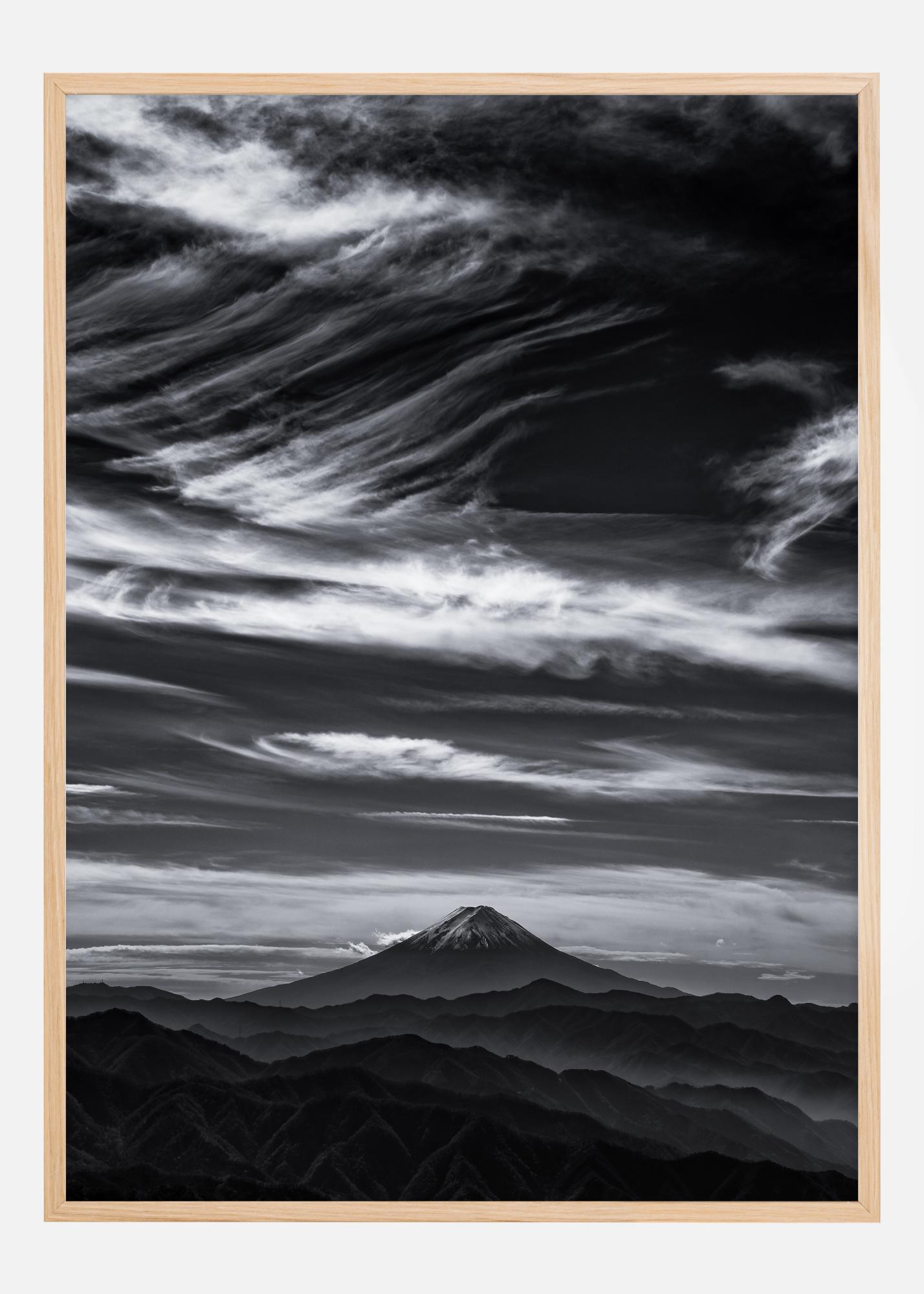Afișul acesta reprezintă în alb-negru mărețul munte Fuji, îmbrățișat de un joc dramatic de nori și vânturi pe cerul de deasupra. Contrastul dintre lanțurile muntoase întunecate și cerul moale oferă o impresie vizuală puternică și dinamică, care este atât atemporală, cât și fermecătoare.