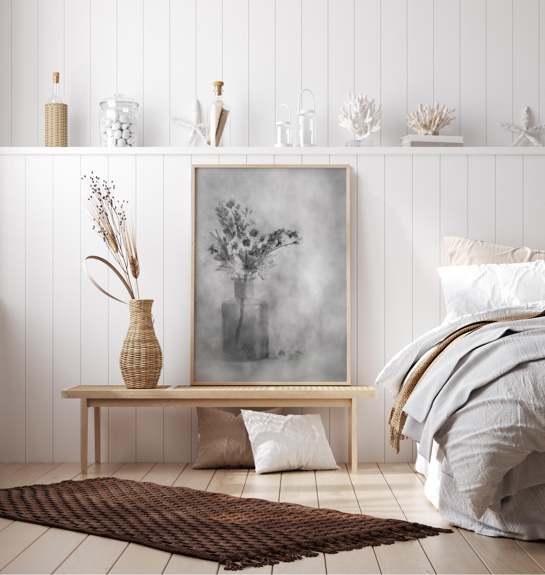 Un poster romantic cu un stil de viață moale cu o vază și flori. Această imagine nuanțată de gri are un sentiment pictat moale și minim de contraste între diferitele părți ale imaginii. Imaginează-ți că te pregătești să pictezi această scenă liniștită atunci când o atârni pe un perete în culori pastelate acasă.