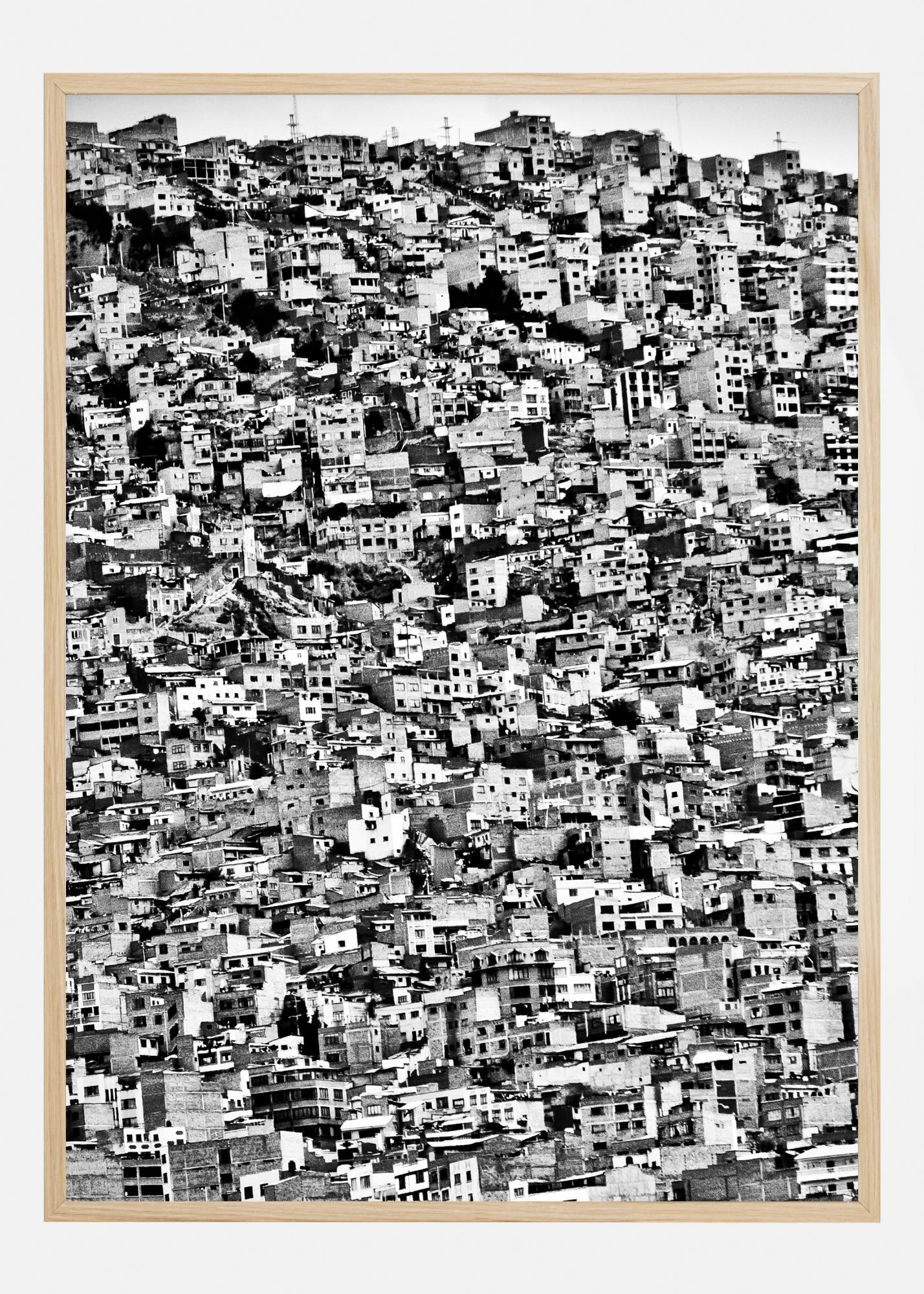 Un poster cu peisaje urbane cu sute de case mici din El Alto La Paz Favela din Bolivia. Imaginea este plină de fațadele albe ale caselor și ferestrele lor negre deschise, care creează o imagine neliniștită, dar fascinantă. Pierde-te în labirintul de case atunci când atârni aceasta în casa ta.