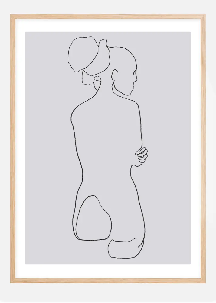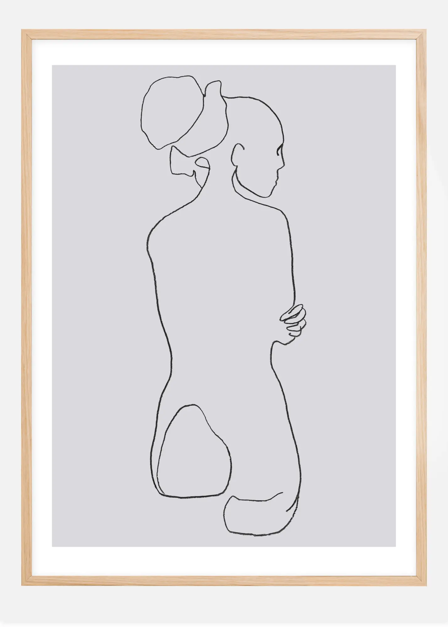 Artă linie grațioasă care înfățișează spatele gol al unei femei și părul prins sus, creată de artistul Jörgen Hansson la Jörgen Hansson Art. Un poster elegant care poate fi combinat cu lucrările lui Jörgen Hansson, Female Lines II și Female Lines III.