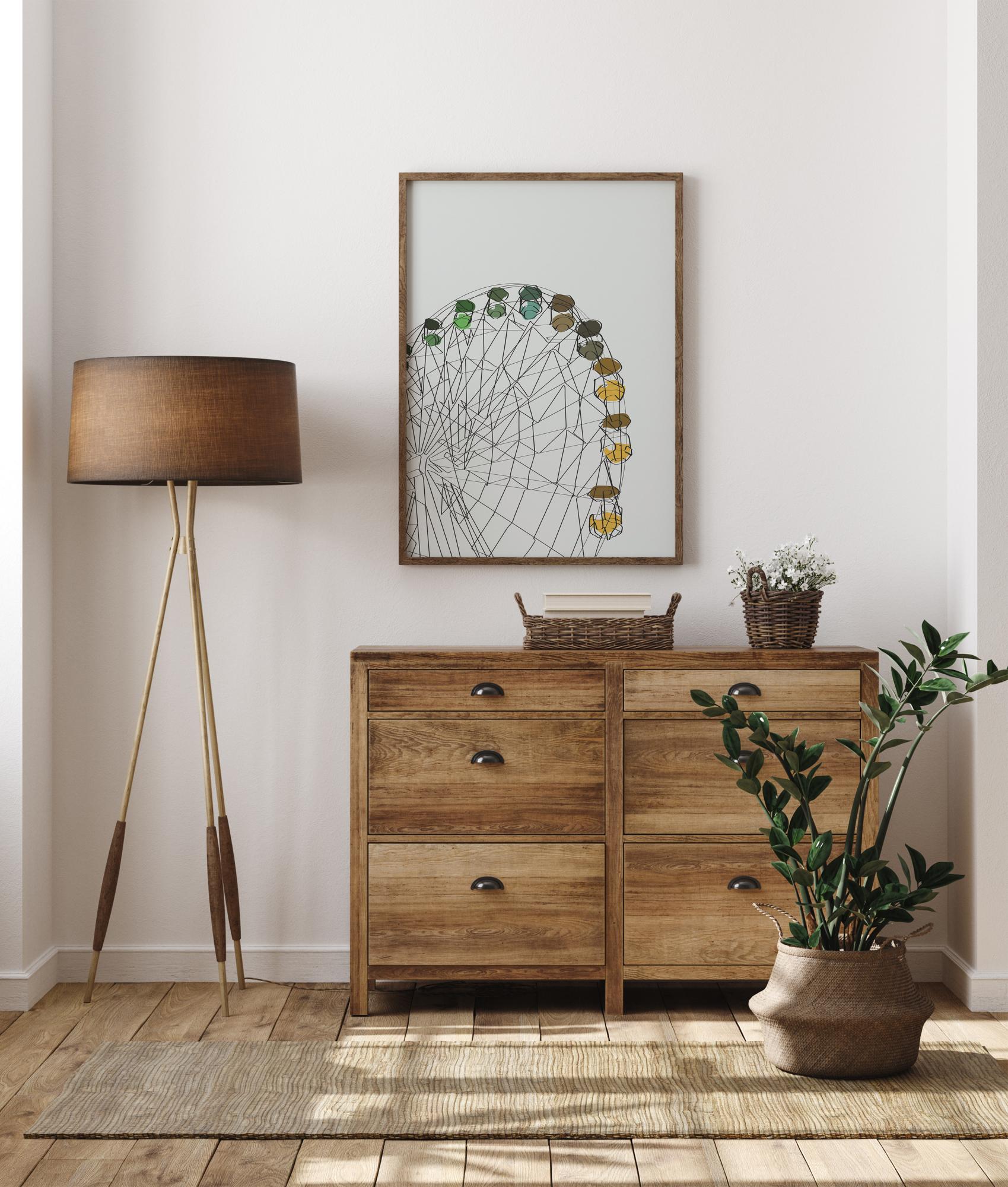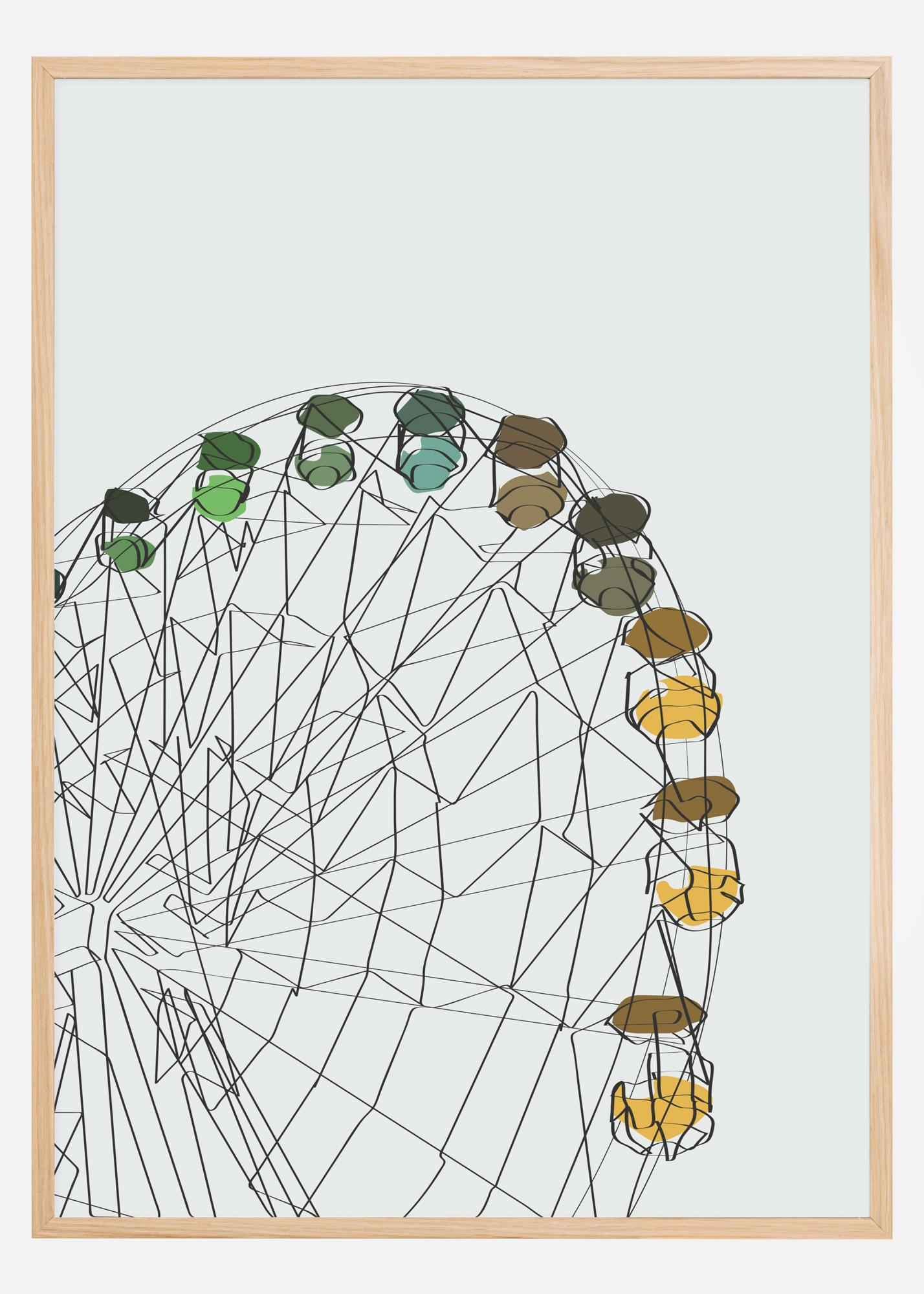 Artă grafică liniară a unui roată panoramică cu coșuri în tonuri pământii pe un fundal deschis, creată de Linn Westanbäck. Un poster elegant care transmite un amestec minunat de calm și aventură. Aruncă o privire și la celelalte produse ale noastre de Linn Westanbäck pentru mai multe lucrări interesante.
