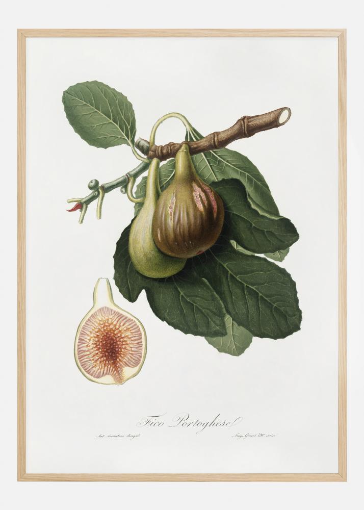 Un poster botanic cu o ilustrație a smochinelor. Această imagine amintește de vechile imagini școlare, cu desenele sale simple, dar totuși detaliate de pe perete. Pictura în acuarelă surprinde toate detaliile, inclusiv o secțiune transversală a smochinei și semințele din interior.