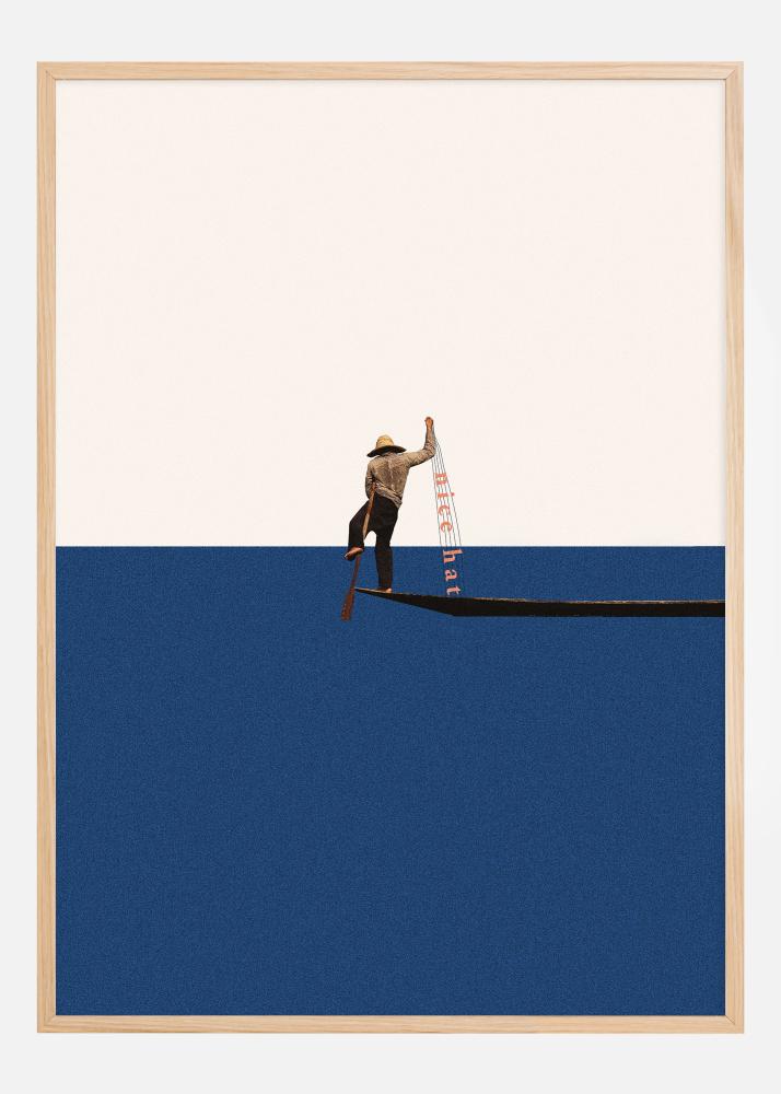 În acest poster creativ și metaforic este captat un instantaneu de răbdare și așteptare. Aici este ilustrat un bărbat îmbrăcat cu o pălărie clasică de pescar și o jachetă, stând ferm pe o barcă maro, pe un contrast puternic cu un lac albastru deschis. El se apleacă peste marginea bărcii, angajat în subtila artă de a „pescui complimente” cu o undiță vie, roșu-albă. Această acțiune introduce o întorsătură umoristică asupra tematicii tradiționale de pescuit și oferă o interpretare contemporană a artei de a căuta și a oferi apreciere.