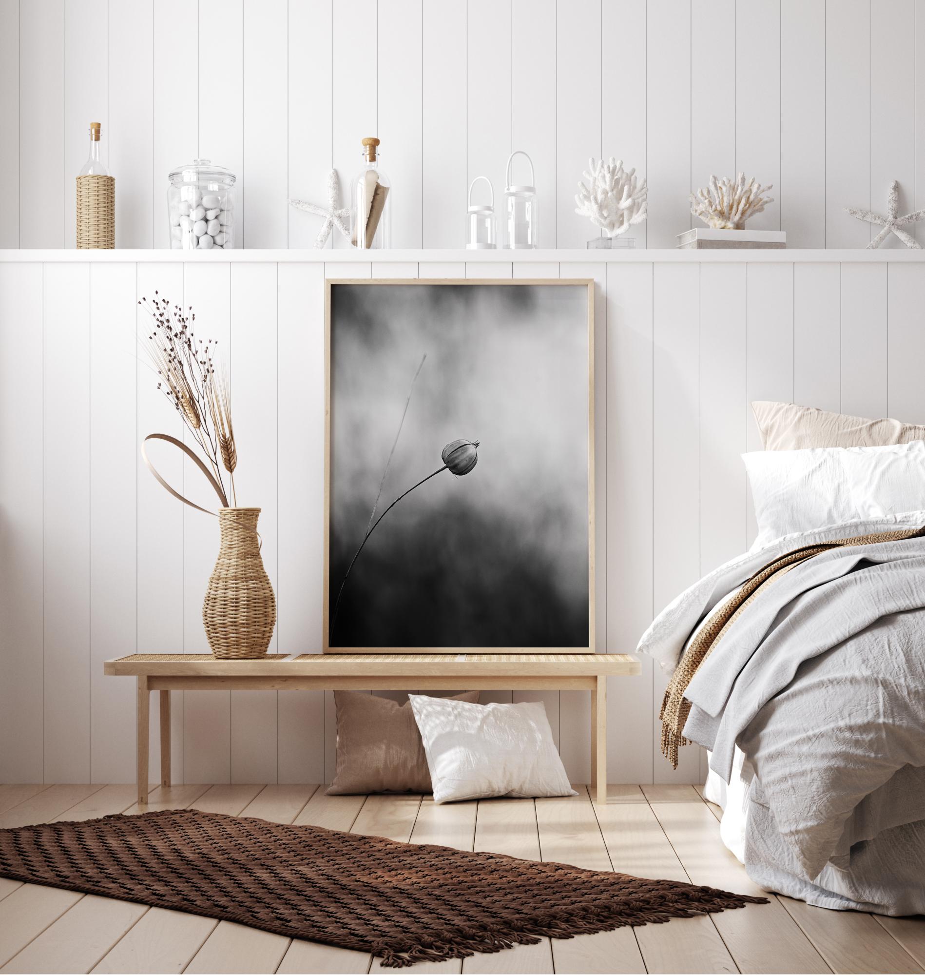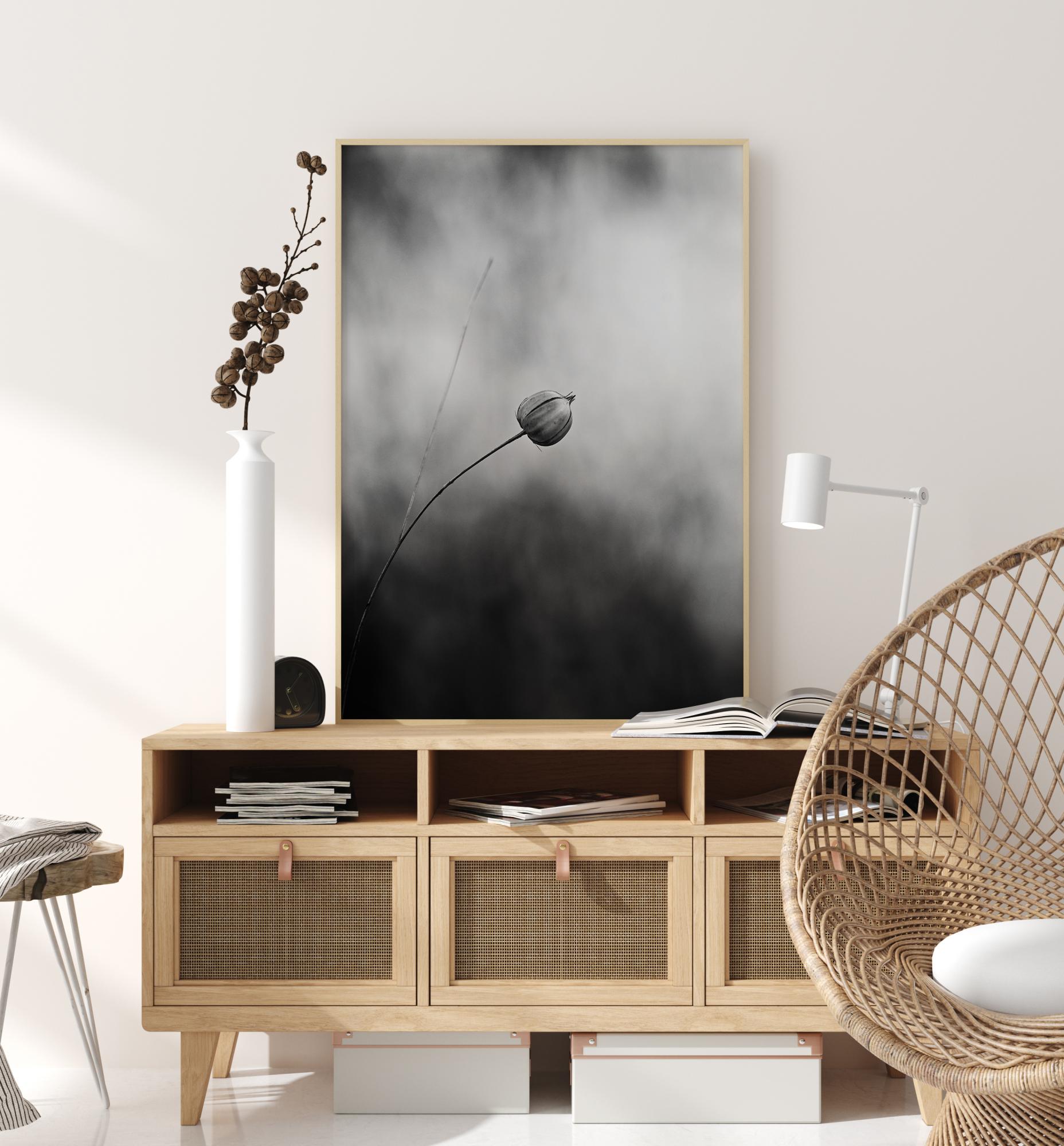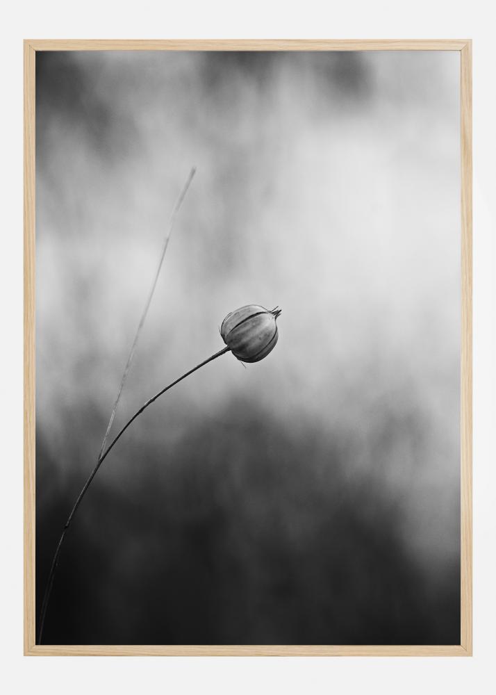 Un poster alb-negru cu o singură plantă de in după ce aceasta a înflorit. Inul se îndoaie spre mijlocul imaginii, ieșind clar în evidență în contrast cu lumina albă. Mai jos, fundalul este întunecat și defocalizat pentru a menține atenția asupra singurei flori. Dă culoare acestei opere cu un perete de bază.