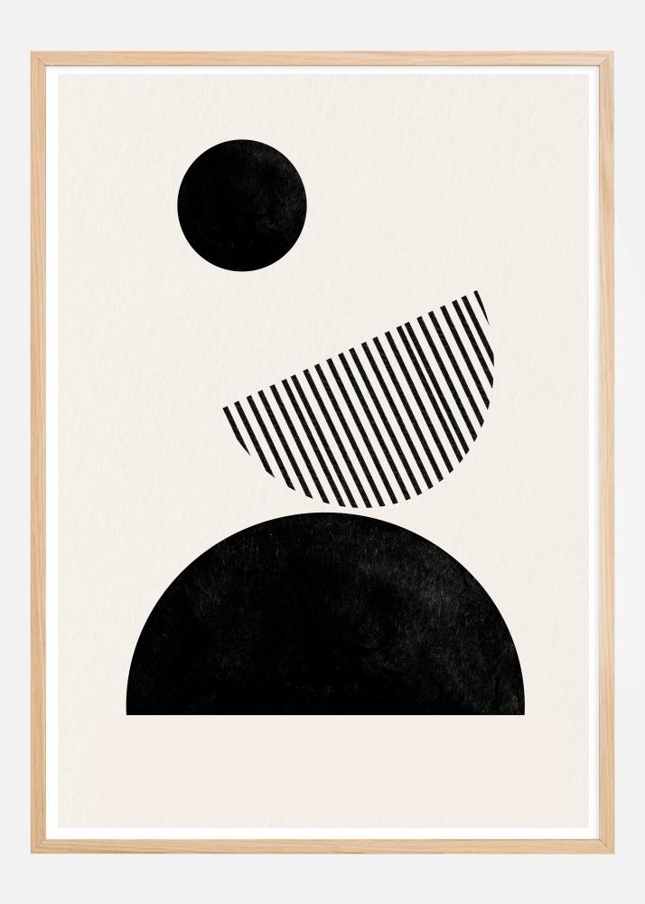 Acest poster artistic se caracterizează prin utilizarea sa jucăușă a formelor geometrice și texturilor pentru a crea o compoziție echilibrată și modernă. Un cerc mare negru este așezat în partea de sus, urmat de o jumătate de cerc cu striații diagonale și o formă de jumătate de cerc negru solid la bază. Fiecare element contribuie la o senzație de mișcare și dinamism, în timp ce colorația unitară creează o senzație de coerență și simplitate.