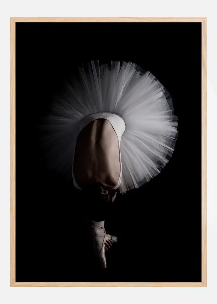 O afiș dramatic cu vedere aeriană a unei balerine care se apleacă înainte pentru a-și atinge pantofii. Fundalul negru face ca fusta albă de balet să iasă în evidență într-un cerc luminos în jurul ei. Liniile puternice ale spatelui conduc ochiul către picioarele elegant ascuțite. Eleganța și drama se îmbină în această imagine unică.