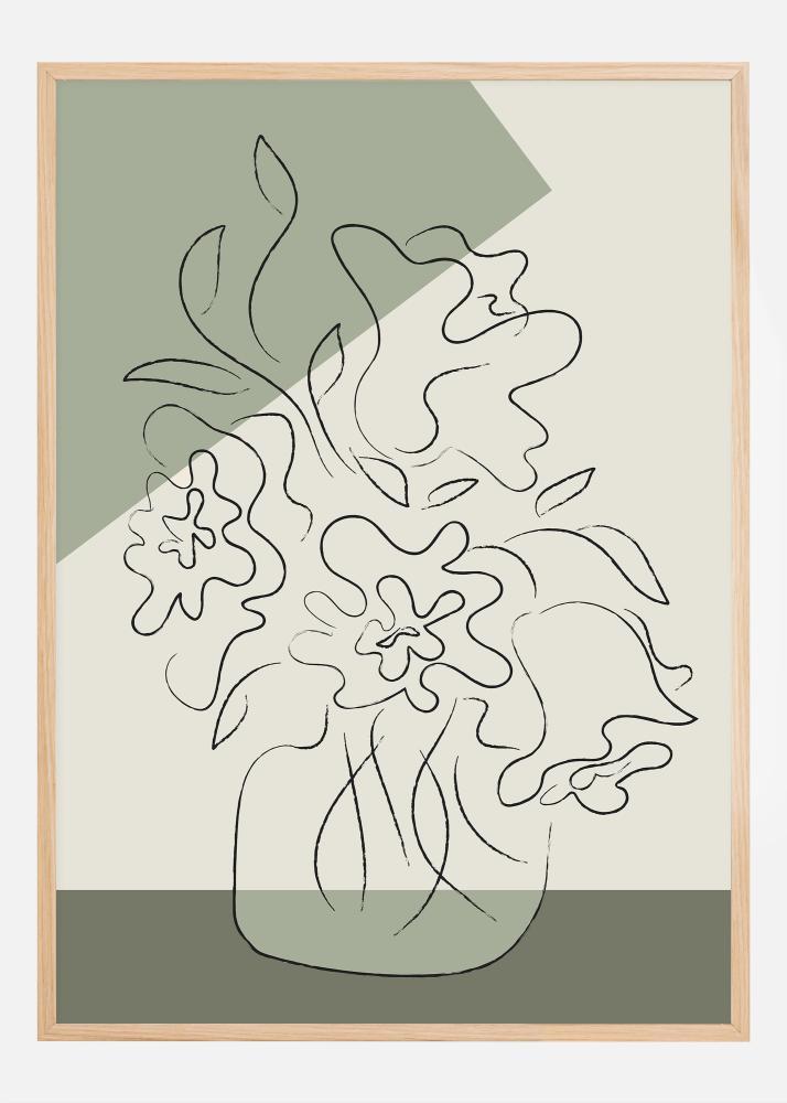 Această poster artistică abstractă ilustrează petale și frunze stilizate într-un desen elegant, cu linii fluide, care plutesc pe un fundal dublu colorat în tonuri moi de verde și neutru. Frumusețea simplă a designului, amplificată de o textură subtilă ce oferă o senzație organică, creează o atmosferă relaxantă și calmă. Acest model modern și stilat s-ar potrivi perfect într-o casă minimalistă sau inspirată de stilul scandinav, aducând o notă de liniște naturală fără a copleși camera cu prea multă culoare sau complexitate.