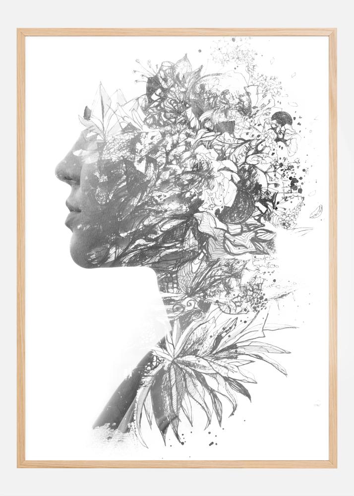Această posteră artistică combină profilul unei femei cu o ilustrație detaliată și complexă de flori și plante, creând o fuziune fascinantă între figura umană și detaliile fine ale naturii. Schema de culori alb-negru oferă o senzație atemporală și evidențiază textura subtilă și complexitatea atât a figurii umane, cât și a motivelor florale.