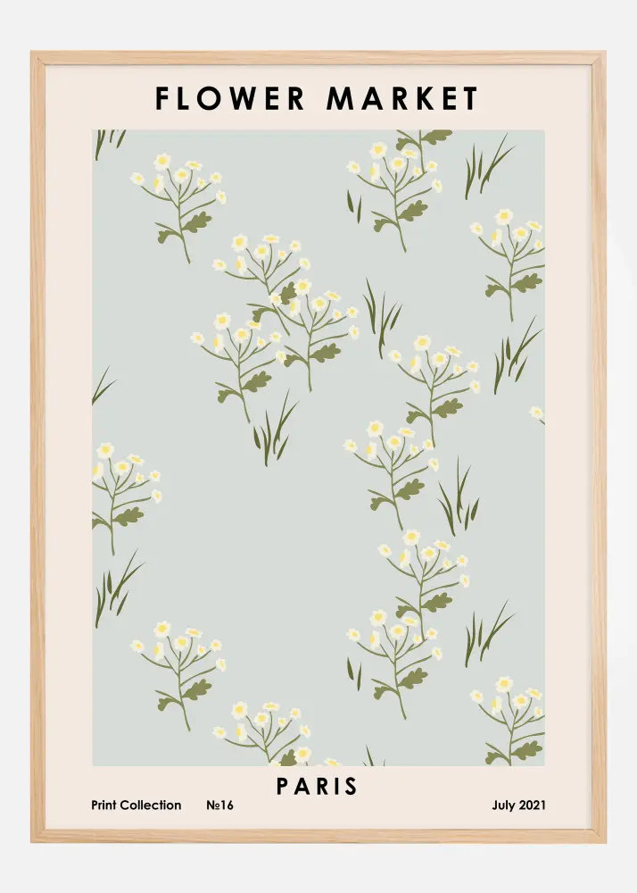 Această afiș captivant și elegant te duce direct în inima Parisului cu imaginea sa a unei piețe de flori. Prezintă un model de flori albe delicate pe un fundal gri-albăstrui liniștitor, oferind o senzație de prospețime și eleganță simplă. În partea de sus se află textul "FLOWER MARKET" într-o tipografie clasică, în timp ce partea de jos conține textul "Print Collection ?16 PARIS July 2021", adăugând o senzație de autenticitate și context cultural.
