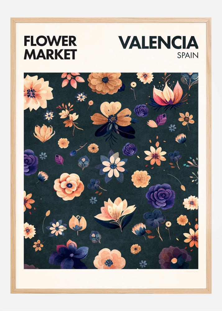 Această poster colorat și plin de viață ilustrează splendoarea florilor de pe piața de flori din Valencia, Spania. Motivele detaliate sunt un omagiu adus diversității florilor de pe piață, unde fiecare soi și culoare pare a fi surprins în plină floare. De la pastelurile delicate până la culorile îndrăznețe și saturate, designul surprinde senzația unei oaze luxuriante în mijlocul inimii orașului.