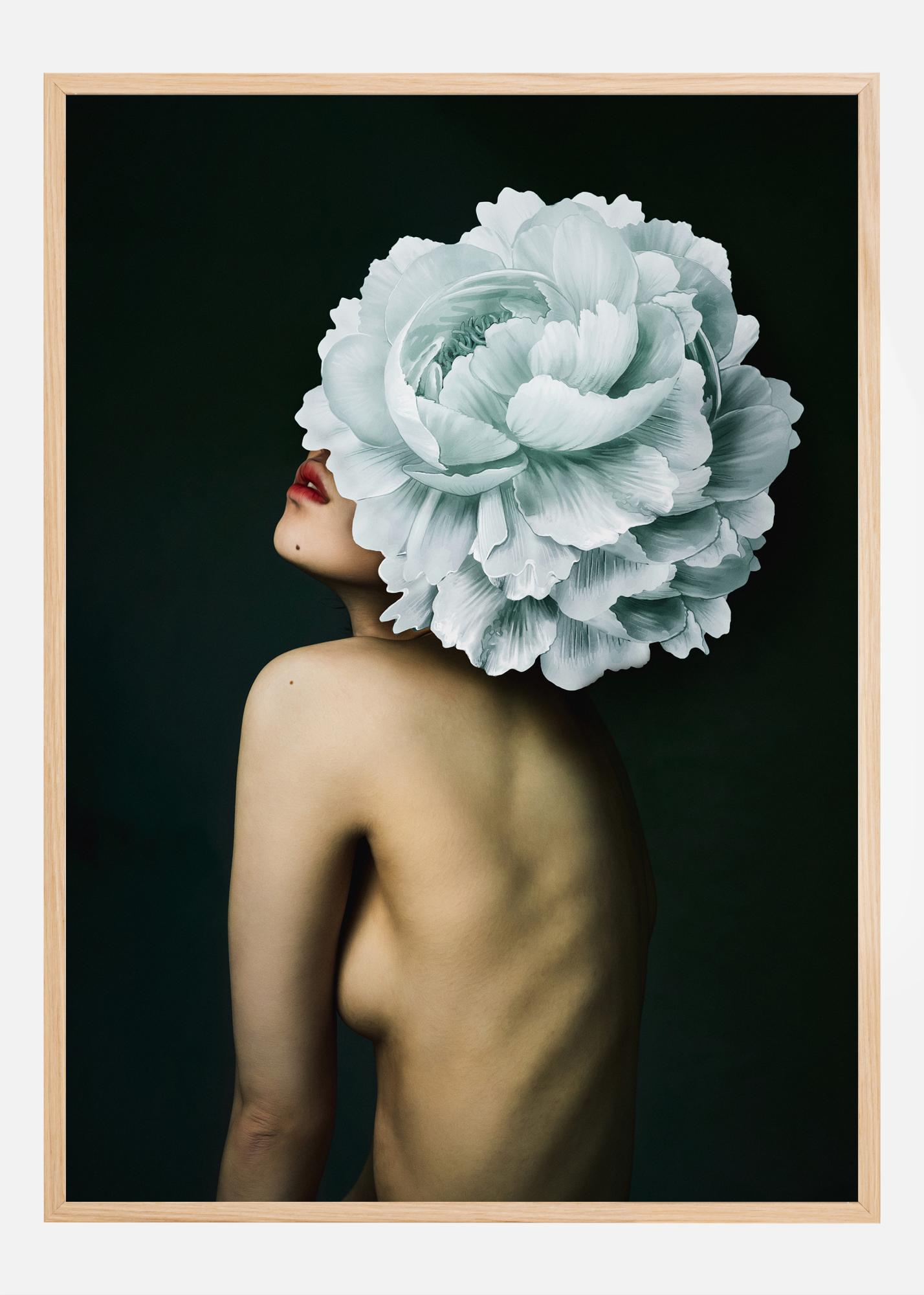 Acest poster ilustrează o compoziție fascinantă și artistică în care frumusețea umană întâlnește minunile naturii. Imaginea înfățișează o persoană văzută din spate, cu capul înlocuit de o floare grandioasă, aproape supradimensionată, de culoare albă. Contrastul dintre pielea moale și floarea detaliată creează o simbioză vizuală care este atât onirică, cât și sugestivă. Schema de culori a imprimării este simplă dar puternică, cu nuanțe de alb, ton de piele și roșul profund al buzelor, pe un fundal întunecat, aproape monocrom.