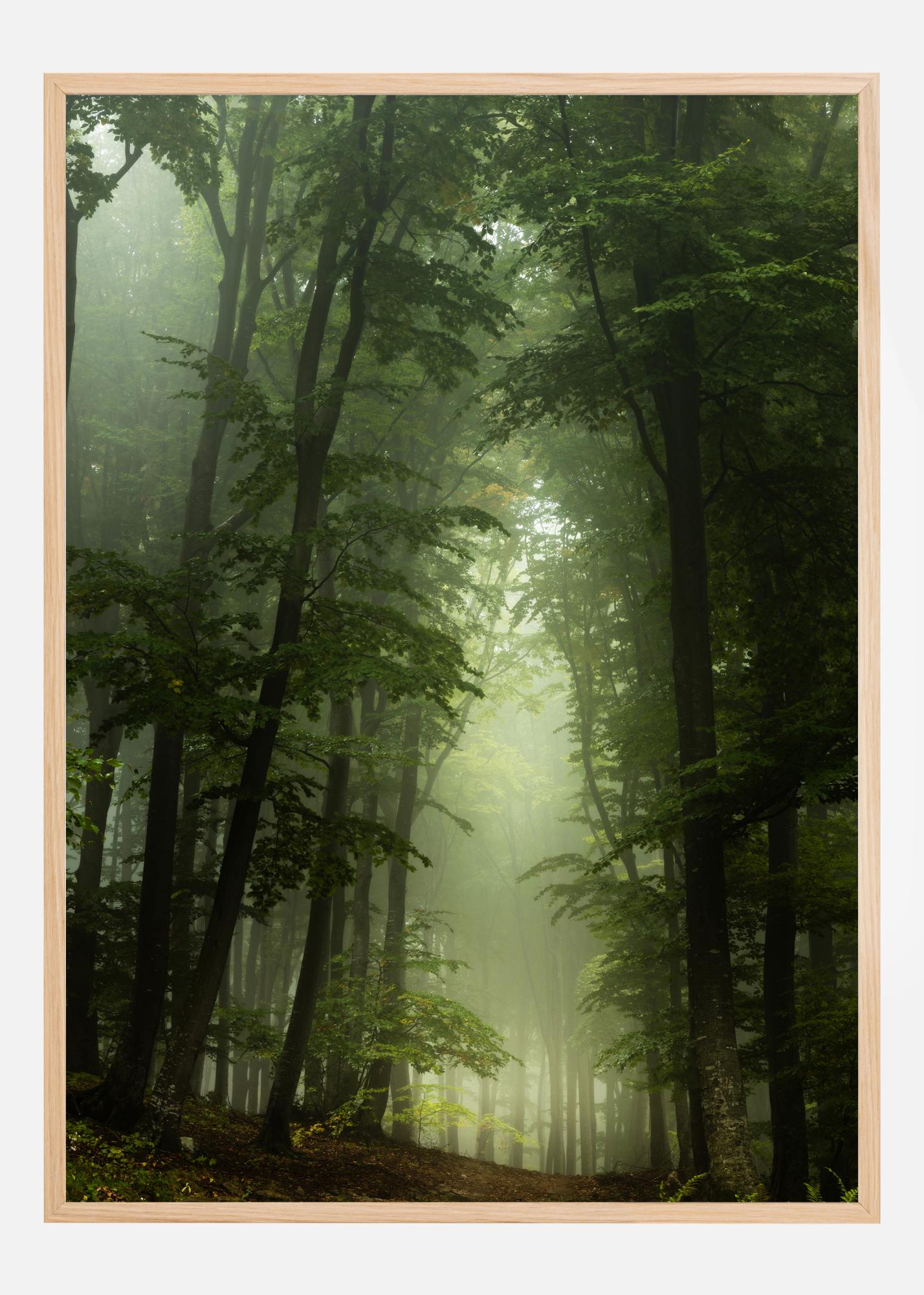 Această poster atmosferic te invită să te pierzi într-o pădure învăluită în ceață, unde fiecare copac pare să-și spună propria poveste. Ceata moale care înconjoară trunchiurile robuste ale copacilor și frunzișul verde vibrant creează o scenă de vis care pare desprinsă dintr-o altă lume. Lumina blândă care se strecoară printre frunze adaugă un sentiment de misticism și liniște.