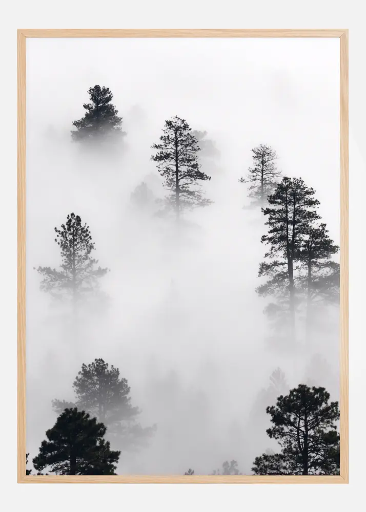 Un poster fantastic cu peisaj având o pădure în ceață. Vârfuri înalte și întunecate de copaci străpung ceața albă palidă și creează un contrast puternic între ceață și copaci. Aduceți senzația răcoroasă de iarnă în casa dumneavoastră când agățați acest poster pe un perete neutru.