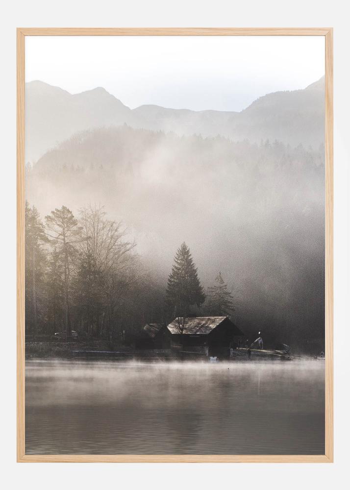Un poster plăcut cu o cabană în munți, situată la marginea unui lac cețos. Pastelurile moi oferă acestei imagini o senzație blândă, unde soarele dimineții strălucește din dreapta pentru a ridica ceața. Agață acest poster pe un perete simplu și pierzi-te în sălbăticia solitară și simplitatea acestui poster plin de atmosferă.