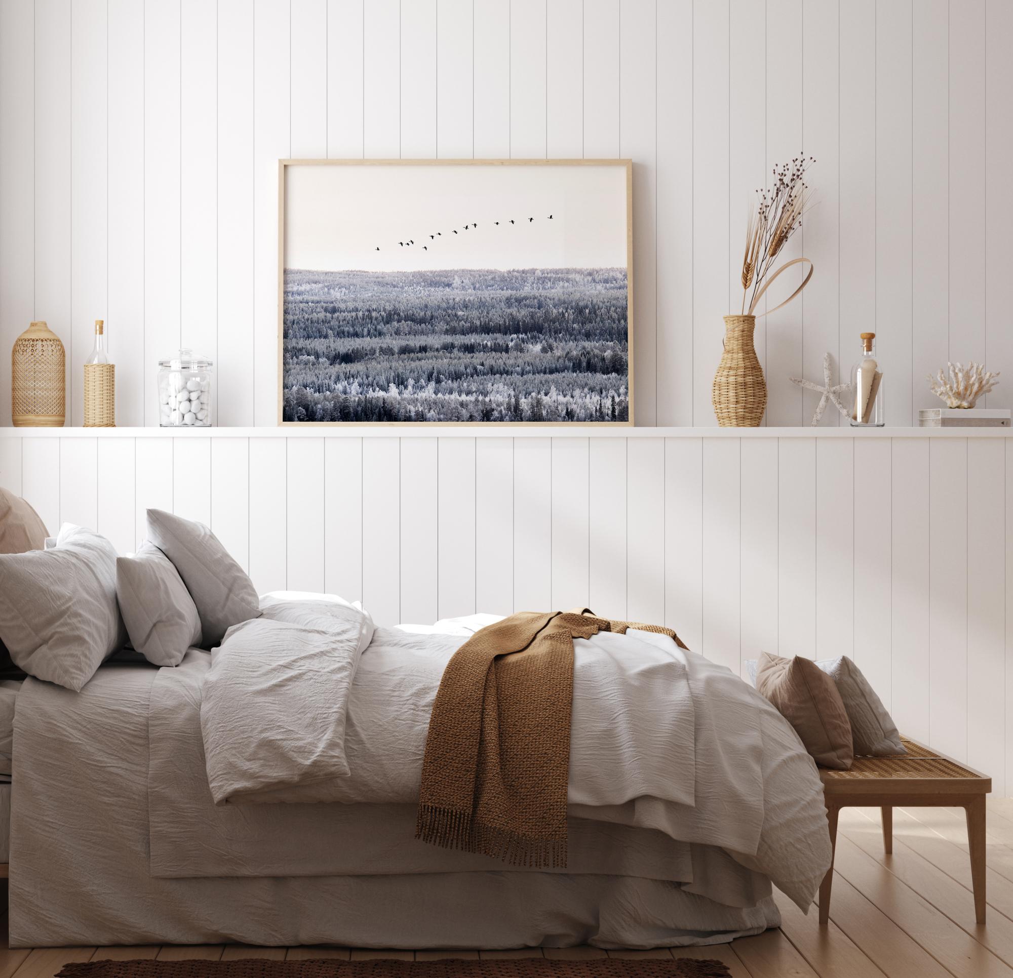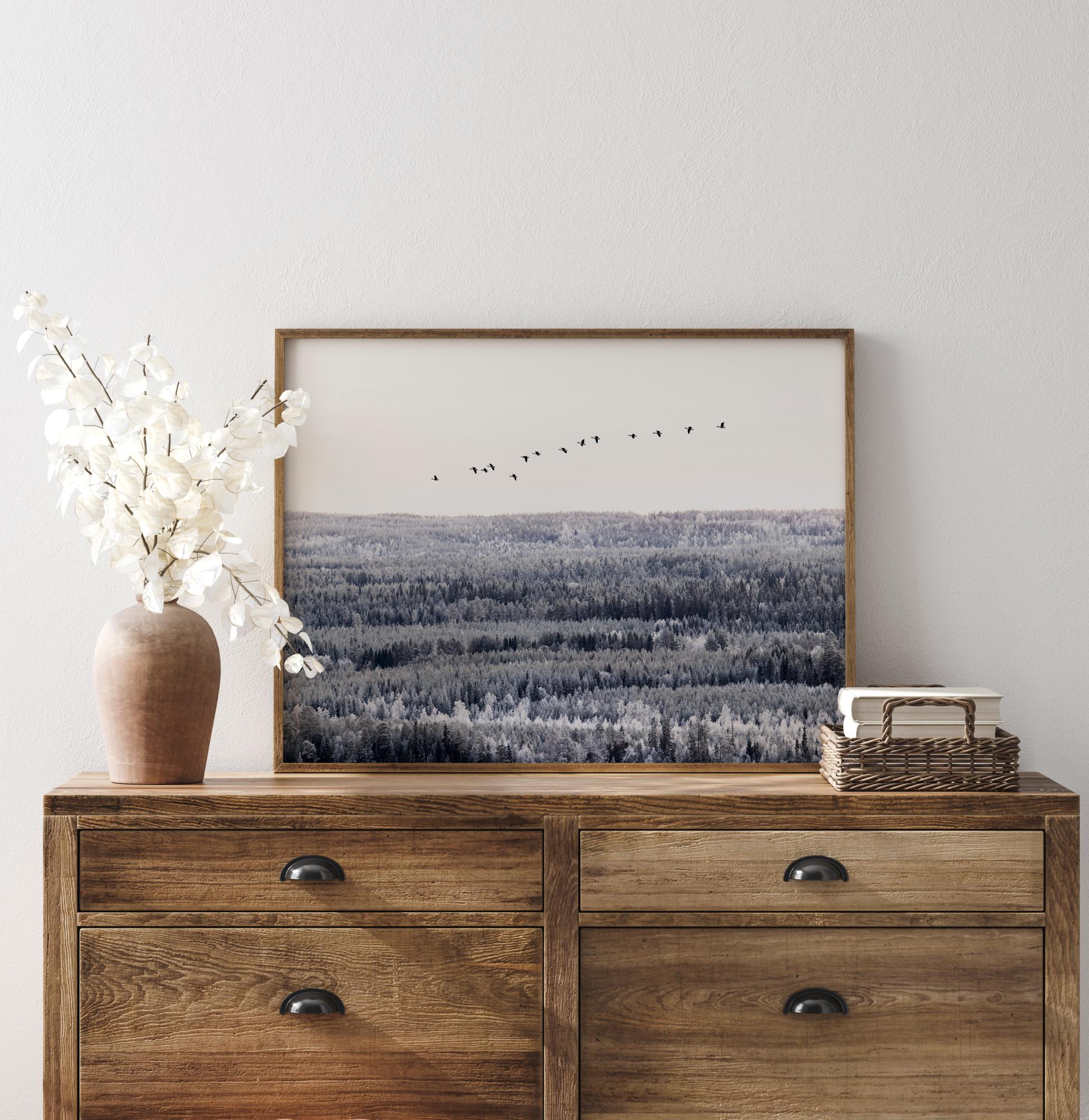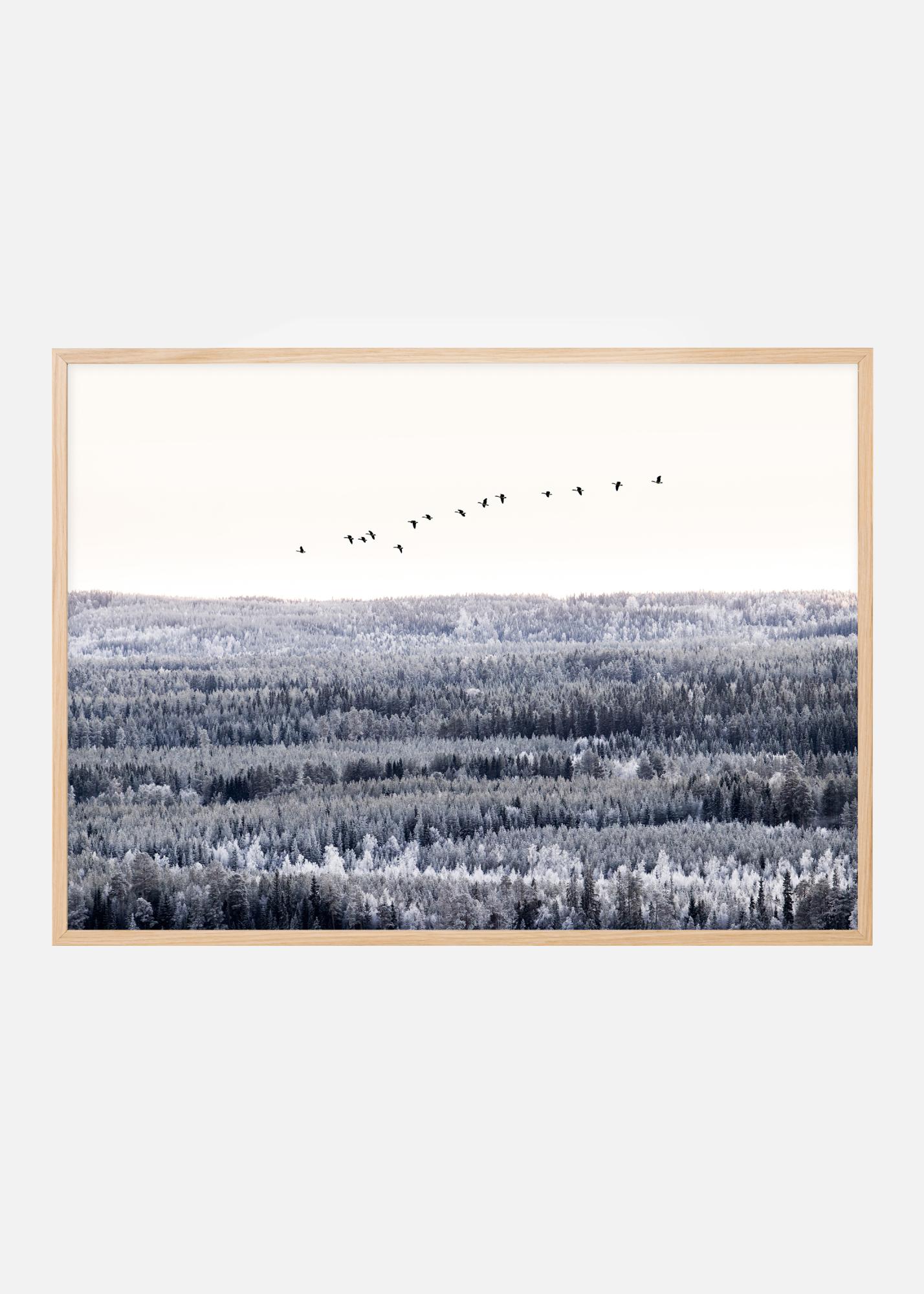 Un poster fotografic cu un stol de păsări migratoare care zboară deasupra vârfurilor copacilor. Pădurea vastă este în tonuri reci sub un cer alb. Un poster care emană o senzație minunată de libertate.