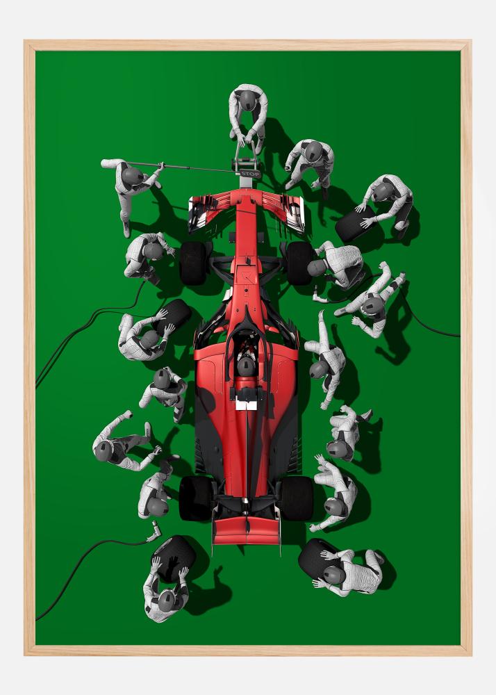 Fundalul verde viu nu doar că sporește atenția asupra detaliilor costumelor gri și albe ale mecanicilor, dar și asupra culorii izbitoare roșii a mașinii de curse. Acest poster surprinde momentul de concentrare colectivă și viteză care definește fiecare cursă, făcându-l un plus perfect pentru oricine iubește viteza și zgomotul motorelor mașinilor de curse. Paleta de culori îndrăzneață a afișului îi conferă energie și puterea de a atrage atenția în orice cameră în care este expus.