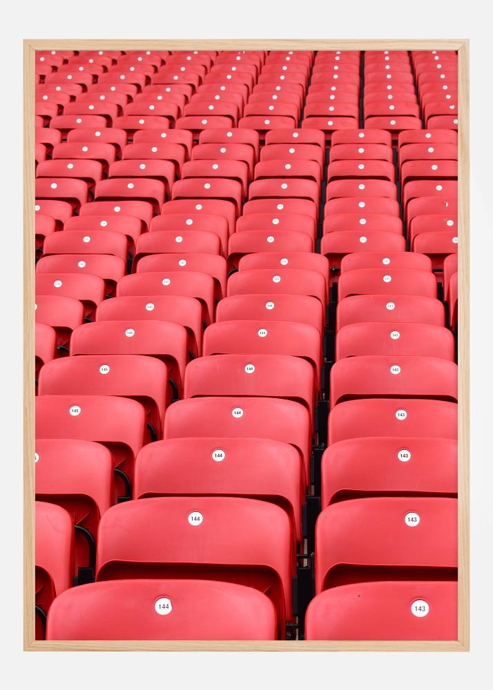 Contrastele dintre scaunele roșii vii și numerele albe, precum și jocul subtil de umbre, creează un efect vizual puternic care completează orice stil de decor. Culorile imprimeului, dominate de roșu și alb, sunt simple dar îndrăznețe și au capacitatea de a aduce viață și energie în cameră. Indiferent dacă este plasat într-un living, într-un birou sau într-o cameră sportivă, acest poster va inspira și va aminti de momentele de neuitat împărtășite pe marile arene din întreaga lume.