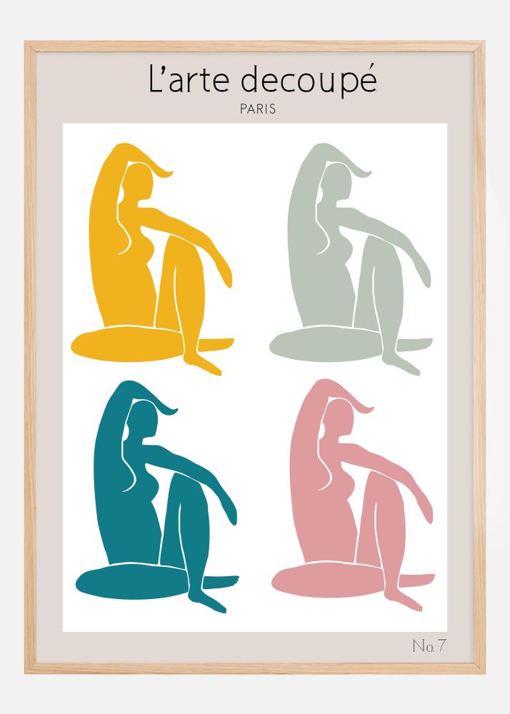 Această poster colorată și contemporană din seria 'L'arte découpé' prezintă patru figuri stilizate într-o compoziție dinamică și armonioasă. Fiecare figură este realizată cu grijă într-o culoare distinctă - galben solar, albastru cer de vară, verde pal și roz cald - și sunt așezate pe un fundal gri care oferă o expresie calmă și echilibrată. Această imprimare artistică celebrează diversitatea și mișcarea formei umane prin designul său abstract și simplificat, creând o expresie vizuală puternică care se potrivește bine într-un stil de interior modern.