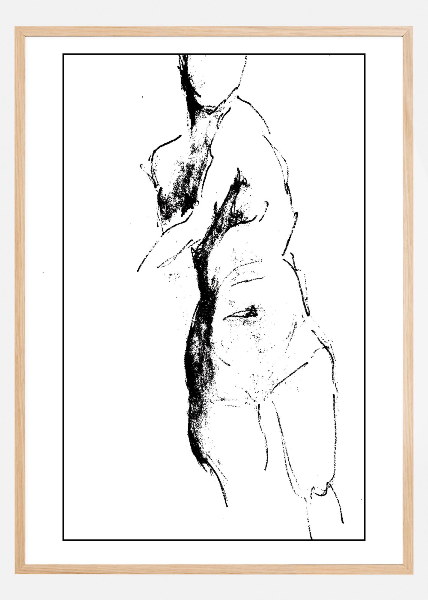 Un poster cu un desen de figuri cu o femeie goală care se întoarce. Stilul desenat al acestei imagini ajută la crearea unei senzații de mișcare când modelul se întoarce și își leagănă brațele peste piept. Această imprimare alb-negru va arăta fantastic pe un perete colorat.