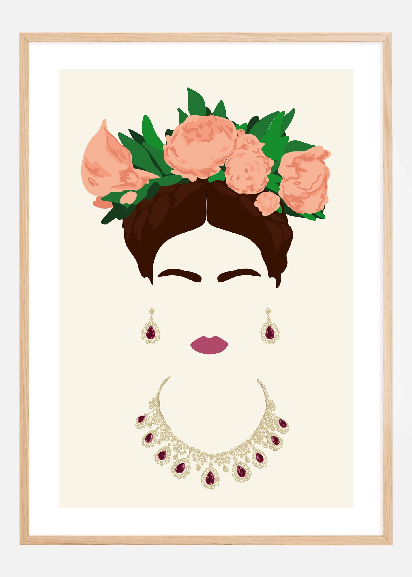 Această afişă distinctă ilustrează o figură feminină stilizată, împodobită cu o floră bogată și bijuterii elegante. Motivul prezintă o compoziție armonioasă de păr șaten închis, piele crem și o coroană strălucitoare de flori corai-roz completată cu frunze verde-închis. Trăsăturile feței sale sunt reduse la forme minimaliste, oferind o senzație modernă.