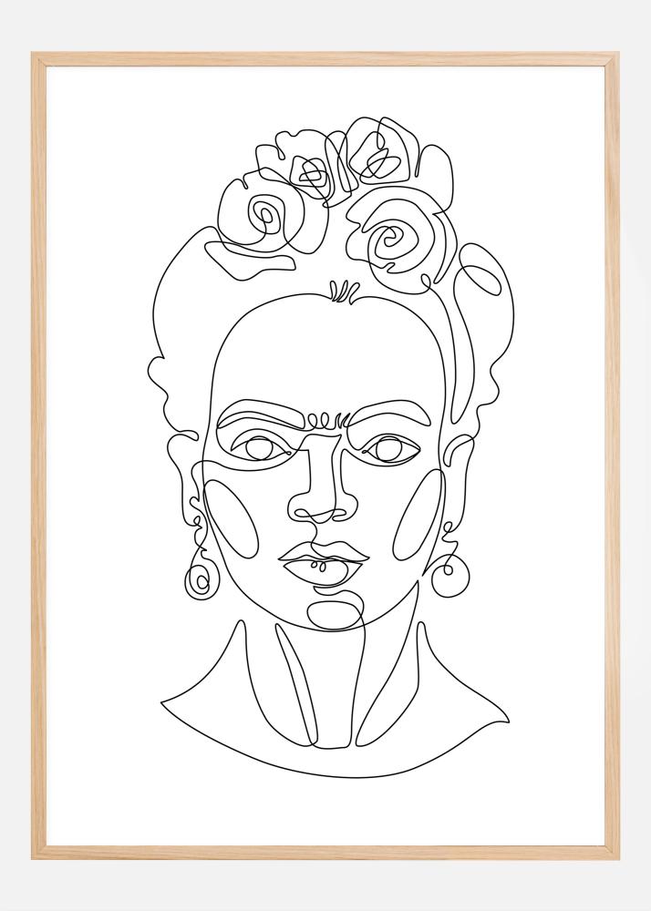 Această poster minimalist ilustrează un desen stilizat al unei figuri feminine cu o înfățișare elegantă, împodobită cu flori în păr și cercei clasici. Opera de artă este realizată dintr-o singură linie continuă, oferind o abordare modernă portretului tradițional. Paleta de culori este pură și simplă, limitată la linii negre pe un fundal alb, oferind o senzație rafinată care se potrivește bine într-o casă modernă sau minimalistă.