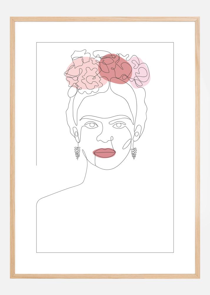Un poster portret abstract cu Frida Kahlo cu flori în păr. O schiță simplu desenată a Fridei capturează imediat esența ei, deoarece ea privește îndrăzneț afară din pictură. Singurele pete de culoare sunt buzele ei și podoaba florală din păr. Potrivește aceste culori pe peretele unde o agăți.