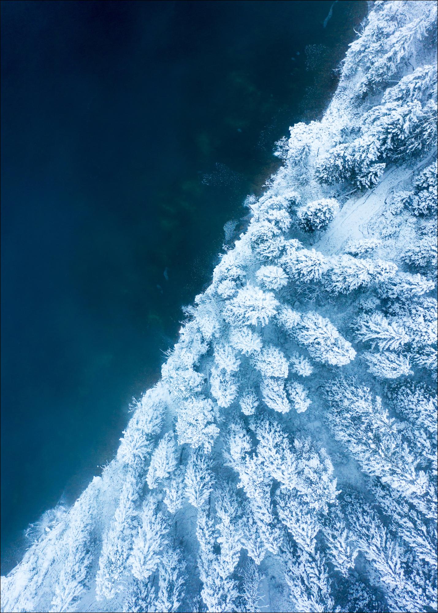 Un poster fotografic captivant din perspectivă aeriană unde pădurea acoperită de zăpadă întâlnește o mare înghețată albastră într-o diagonală ascuțită. Un poster frumos cu natură în tonuri reci, perfect pentru a fi parte a unui colaj mai mare.