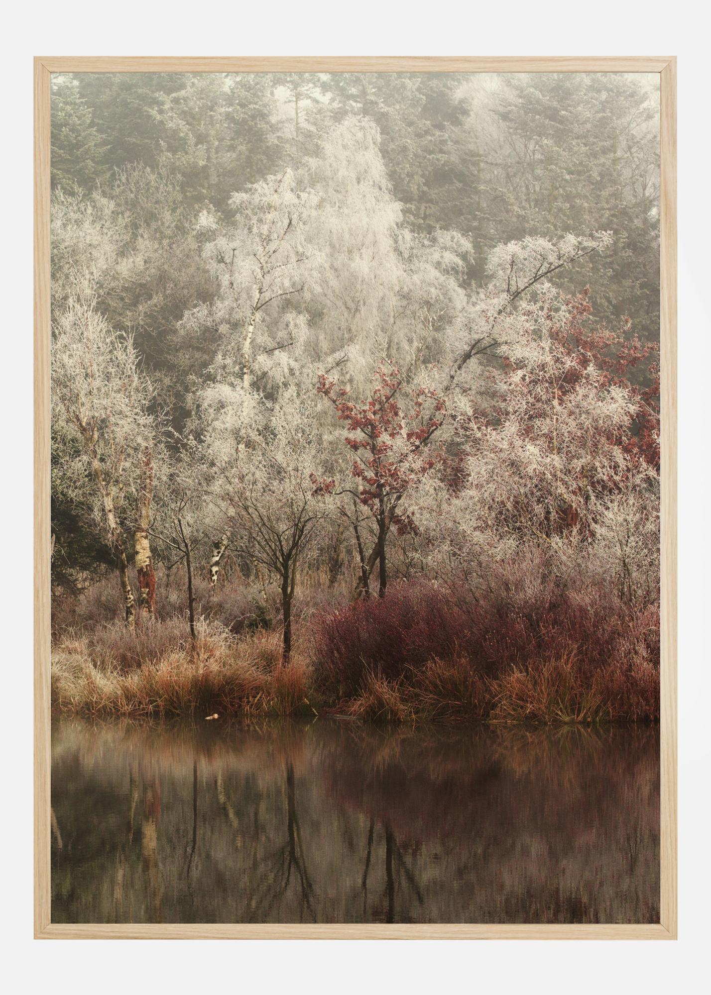 Un poster liniștit și tăcut cu un peisaj înghețat de pădure. Un lac clar și liniștit se află în prim-plan cu iarbă de un roșu închis și copaci acoperiți de brumă în fundal. Poți aproape simți liniștea și calmul care emană din această imagine frumoasă și magică.