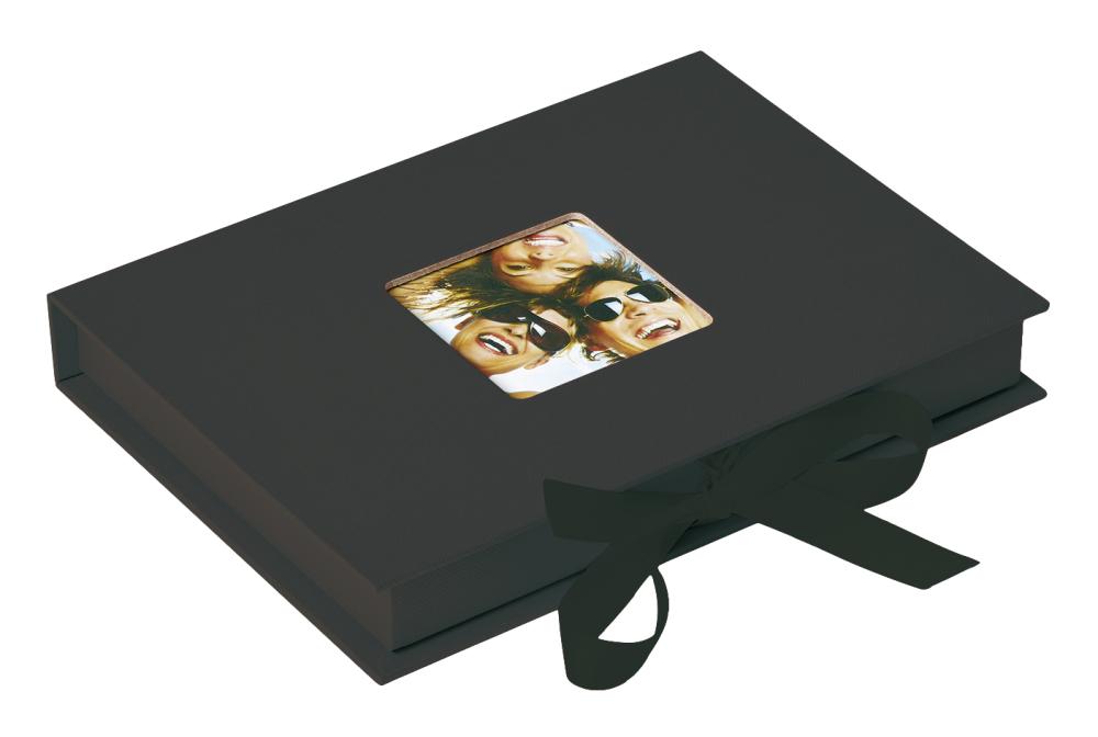 Elegantă cutie foto cu un design modern într-o culoare neagră rafinată care poate cuprinde 70 de imagini de dimensiuni până la 13x18 cm. Pe partea superioară a cutiei există loc pentru o imagine personală (6x6 cm), astfel încât să-ți poți face cutia foto mai personalizată.